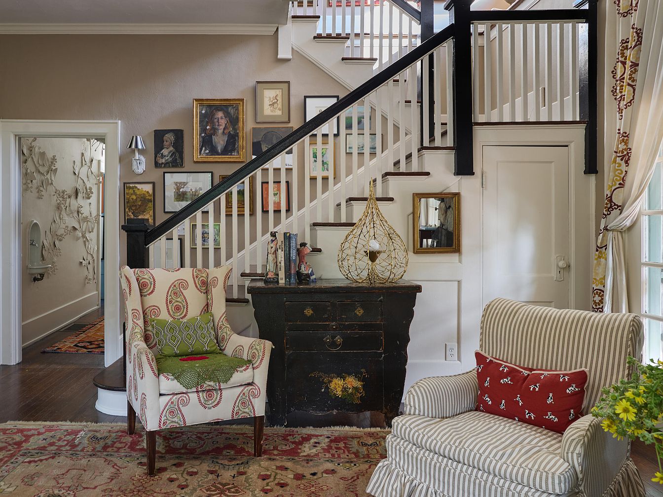 A charming sitting area is arranged at the base of a staircase in a cozy family home. The space features two comfortable chairs, one with paisley upholstery and the other striped with a red accent pillow featuring small dog motifs—a playful touch for families with children. The dark wood chest against the staircase wall displays decorative items, and the staircase itself is adorned with white spindles and a dark handrail, creating classic architectural contrast. Family-friendly touches include easy-to-clean hardwood floors with an area rug, and abundant framed artwork adds warmth. Large windows with patterned drapes allow natural light to fill the space, making it inviting for all ages.