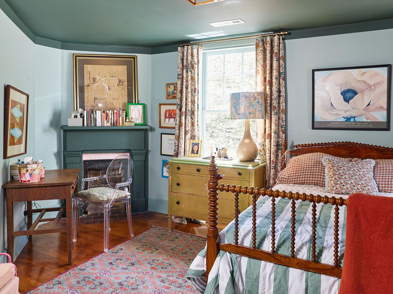 Warm and inviting bedroom featuring a classic wooden bed with intricate spindle posts and cozy, checked bedding. The room is painted in soft blue-green tones, creating a calm and soothing atmosphere perfect for families. A floral rug covers polished hardwood floors, complementing the patterned curtains framing a large window that lets in natural light. The room includes a vintage wooden desk with a transparent chair, ideal for study or creative activities, and a fireplace mantel adorned with books and art. Thoughtfully selected artwork, family photos, and sentimental decor enhance the space’s welcoming and personal feel, making it both practical and comfortable for daily living.