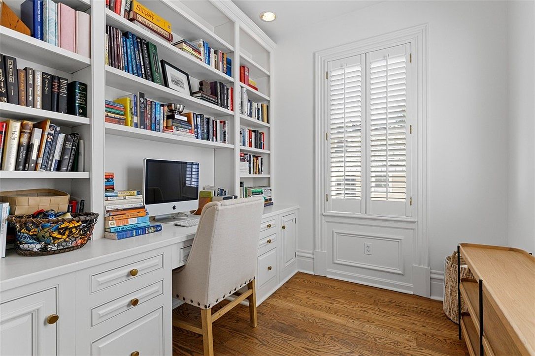 A bright, inviting corner of the house is designed as a home office, featuring built-in white shelves filled with a colorful array of books for a stimulating work or study environment. The desk area, with gold-accented drawers and a soft upholstered chair, provides a comfortable setting for productivity, easily accommodating both kids and adults. Natural light streams in through large white-shuttered windows, highlighting the warm wooden floors. Ample storage, a tidy desktop with a computer, and decorative baskets encourage organization, making this office ideal for family use, whether for work, homework, or quiet reading time together.