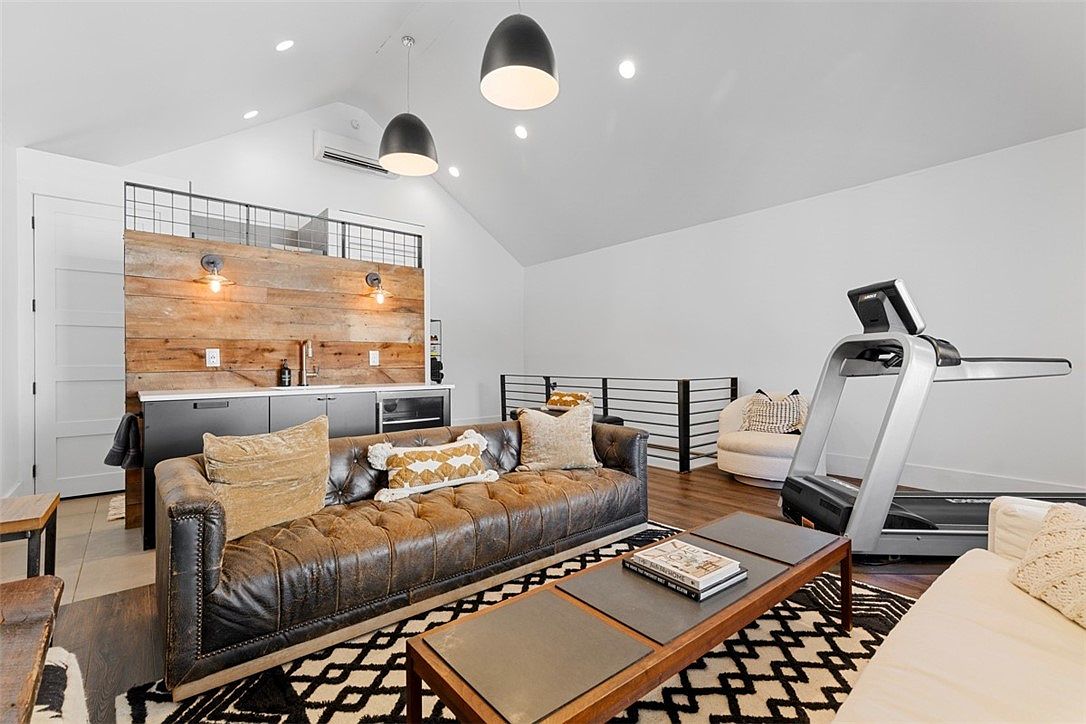 Spacious family lounge with a cozy, rustic-modern vibe. The room features a classic tufted leather sofa adorned with soft, earth-toned pillows, paired with a minimalist rectangular coffee table on a bold geometric rug. Light wood flooring and a feature wall of horizontal wooden planks bring warmth, while a built-in wet bar with black cabinetry and industrial-style sconces makes entertaining easy. Modern pendant lighting, white walls, and sloped ceilings create an airy feel. A treadmill in the corner and a plush round chair offer both fitness and relaxation options, making this area comfortable and functional for all ages.