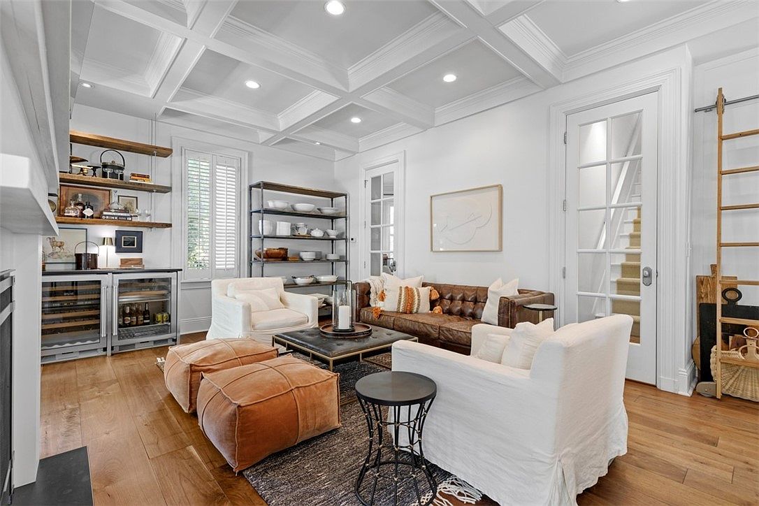 A bright and inviting living room features a warm color palette with white walls and ceiling, complemented by honey-toned hardwood floors. The space is anchored by a tufted brown leather sofa paired with two white slipcovered armchairs and two large tan ottomans, creating a comfortable seating area perfect for family gatherings. A black coffee table sits in the center atop a dark textured rug. The coffered ceiling adds architectural interest, while built-in shelving and a home bar area provide practical storage and display space. French doors and shuttered windows allow natural light to fill the room, promoting a family-friendly atmosphere.