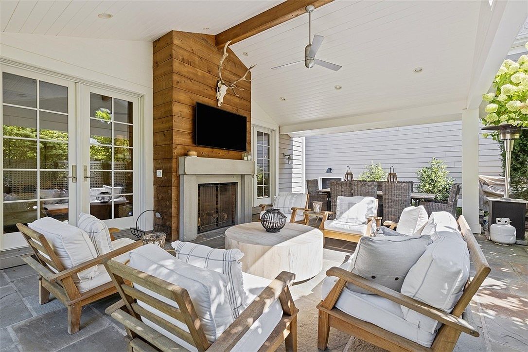 A spacious covered patio designed for relaxation and entertaining features a cozy seating area with cushioned wooden armchairs arranged around a circular, light-colored ottoman table. A modern ceiling fan hangs from the white paneled ceiling, and a wooden accent wall with a mounted television and fireplace provides a warm focal point. The color palette is light and natural, with soft grey slate flooring and neutral-toned pillows adding comfort. Glass doors connect the space to the home’s interior, and a dining area with woven chairs sits in the background, creating a family-friendly and inviting outdoor living area perfect for gatherings.