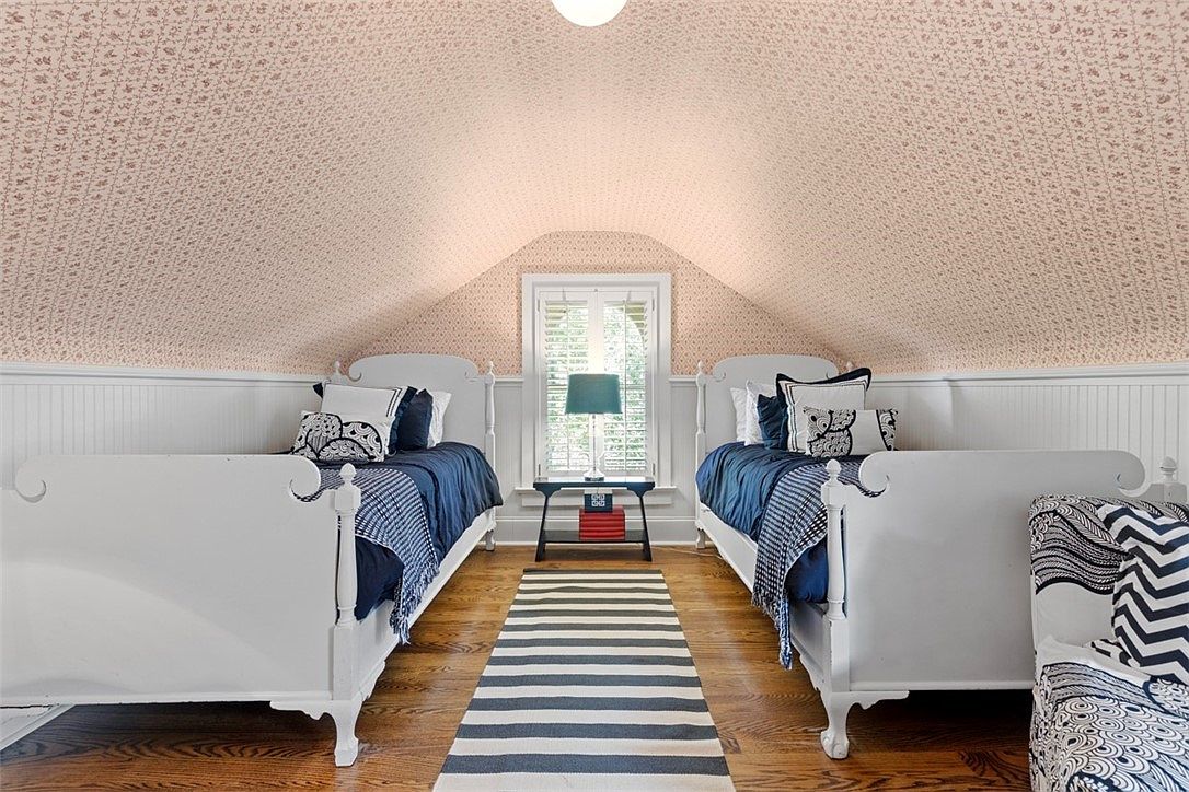 A charming attic bedroom features two white vintage twin beds situated on either side of a stripe-patterned rug atop warm hardwood floors. The walls and sloped ceiling are adorned with soft, blush-toned floral wallpaper above white beadboard wainscoting, adding a nostalgic and cozy atmosphere. Between the beds, a window with plantation shutters brings in natural light, complemented by a small bedside table and a teal lamp, creating a perfect reading nook. The bedding is navy and cream with layered throw pillows and blankets, making the space inviting and comfortable for children or siblings to share and enjoy together.