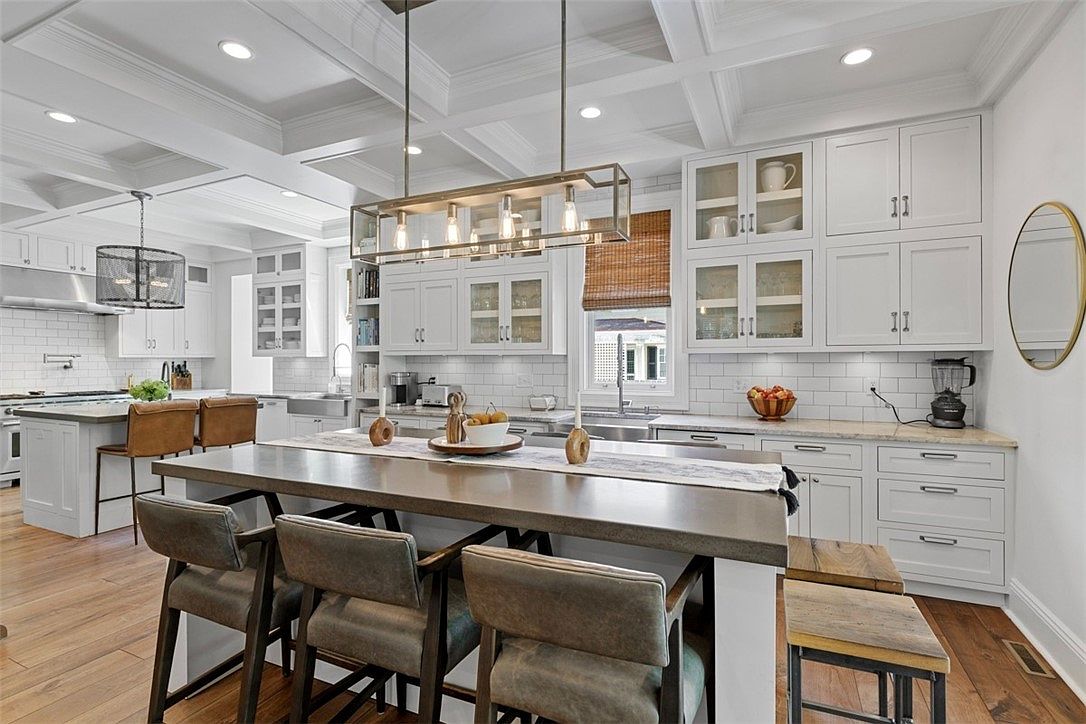 A spacious and inviting kitchen features a large island with ample seating for four, ideal for family meals or helping with homework. The island is topped with a sleek countertop, flanked by plush barstools with leather cushions for comfort. Bright white cabinetry with glass front panels adds elegance and easy access to dishes. Warm wood floors contrast the white subway tile backsplash, creating a cozy yet modern feel. Stainless steel appliances and pendant lighting bring sophistication, while the open layout makes it easy for families to gather and move around. Natural light streams through a window with a bamboo shade, adding warmth.