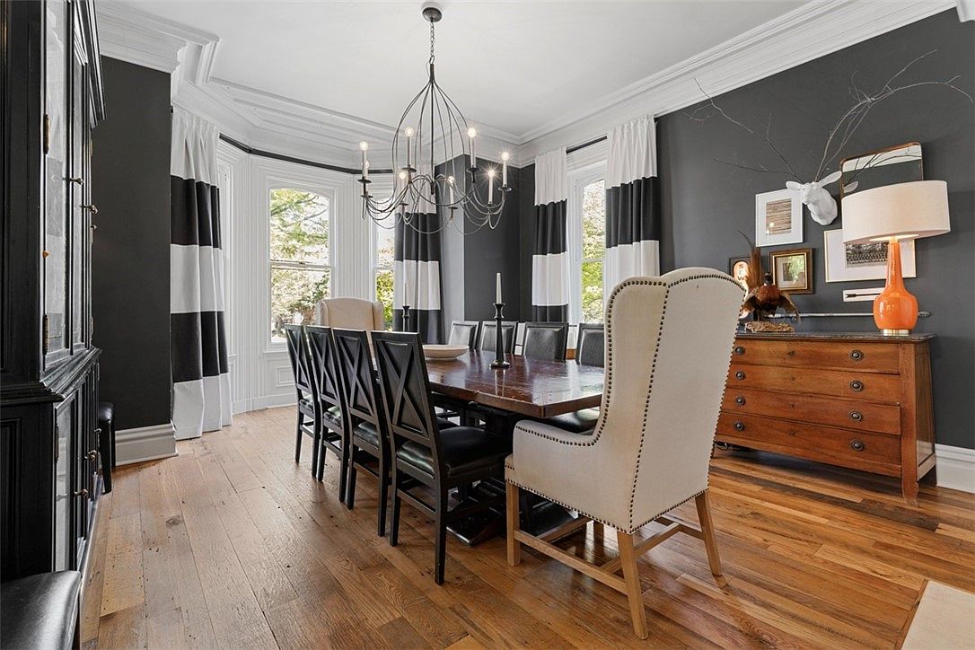 A spacious dining room features a long wooden table surrounded by eight cushioned chairs, with two taller, upholstered armchairs at each end, offering comfort for family meals or gatherings. The walls are painted a deep charcoal gray, while broad windows framed in crisp white casings fill the room with natural light. Bold, black and white striped curtains provide a modern touch and visual interest. A rustic wooden dresser with brass handles sits along one wall, topped with eclectic décor and a bright orange lamp. The warm, wide-plank hardwood floor adds charm and durability, making this a family-friendly, elegant space for entertaining.