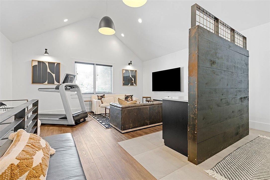 A spacious multi-purpose family room featuring a cozy seating area with a large, black leather sofa and a cream loveseat, both accented by patterned throw pillows. Elegant mid-century modern wall art and stylish black and brass lighting offer a sophisticated touch. A state-of-the-art treadmill sits on warm-toned wooden floors, making fitness convenient. The entertainment zone includes a wall-mounted flat screen TV, perfect for family movie nights. High, vaulted ceilings and large windows fill the space with natural light, while the dark accent partition adds subtle architectural interest without compromising openness, ensuring both functionality and comfort for family gatherings.
