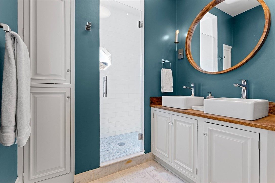 A stylish bathroom features teal blue walls complemented by crisp white cabinetry and a natural wood countertop, creating a warm and inviting space. Twin rectangular vessel sinks with modern chrome faucets provide a practical solution for busy families. Above the sinks, a large round mirror with a wooden frame adds elegance and enhances natural light. Built-in cabinets offer generous storage for toiletries and towels, promoting tidiness. To the left, a glass-enclosed walk-in shower is finished with white subway tiles and a mosaic floor, making it both functional and visually appealing. Soft lighting enhances the calming, contemporary aesthetic.
