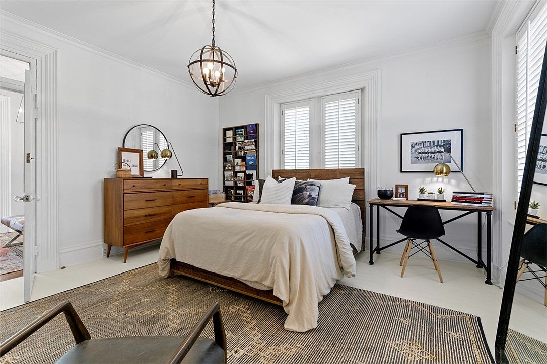 Spacious, light-filled bedroom featuring a large wooden bed with neutral bedding and an array of plush pillows that invites relaxation. The room’s crisp white walls and generous windows with shuttered panels create an airy, welcoming mood. A mid-century modern dresser with a round mirror adds warmth, while a functional desk and chair in the corner provide an ideal workspace for family members. Accents like a woven area rug, a shelving unit for books or keepsakes, and a statement globe pendant light bring style and comfort. Perfect for a family, the design balances functionality with cozy, accessible elegance.