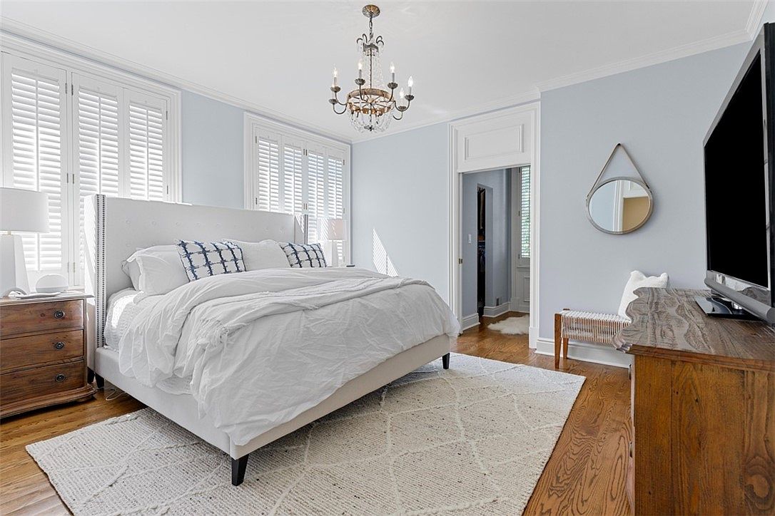 A spacious bedroom with soft blue walls, white trim, and warm wood flooring creates a calming retreat perfect for families. The large, upholstered bed is centered in the room and dressed with crisp white bedding, complemented by blue patterned accent pillows. Sunlight streams in through three tall windows with classic white plantation shutters, ensuring both privacy and natural light. A textured white rug adds coziness for children and pets, while a vintage wood dresser and bedside tables provide ample storage. The elegant chandelier overhead provides a touch of sophistication, and the room’s uncluttered, airy ambiance promotes restful nights and relaxation.
