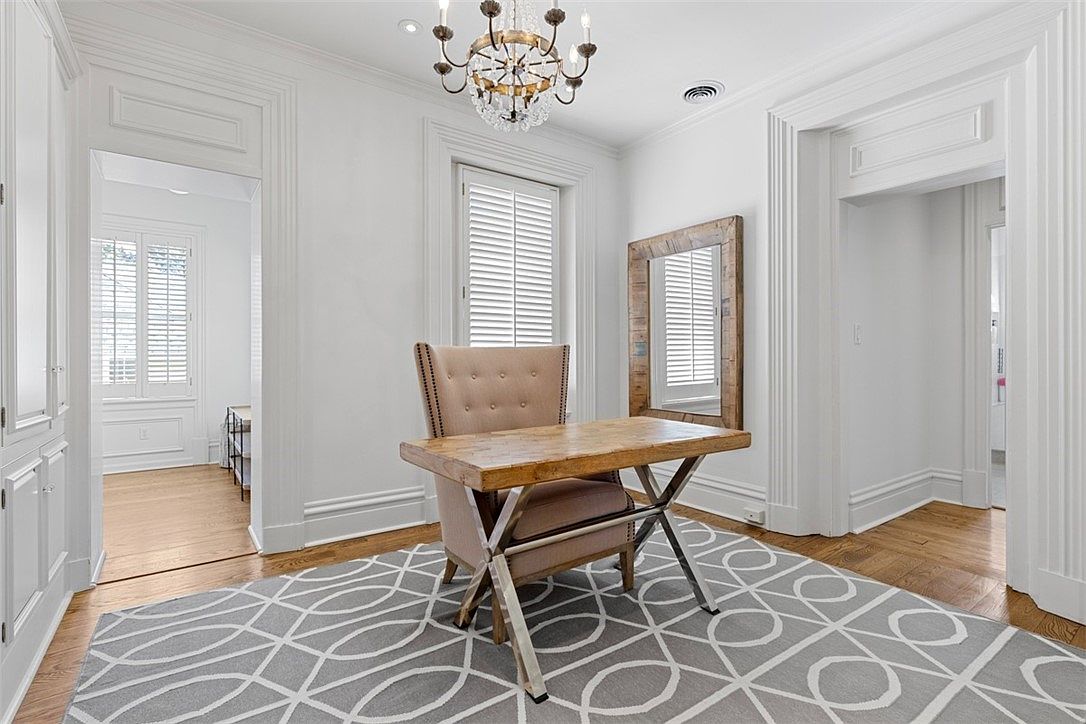 This bright and inviting home office nook features a single, tufted high-back chair paired with a solid wooden desk on modern cross metal legs. Natural sunlight streams in through tall shuttered windows, illuminating the room with a soft, airy glow. A geometric-patterned area rug in gray and white covers part of the warm wooden floor, adding both style and comfort. Elegant white trim and crown molding surround the doorways and windows, giving the space a polished, classic look. A rustic wooden-framed mirror and a delicate, sparkling chandelier add refined touches, making this a comfortable and practical spot for work or study in a family-friendly home.