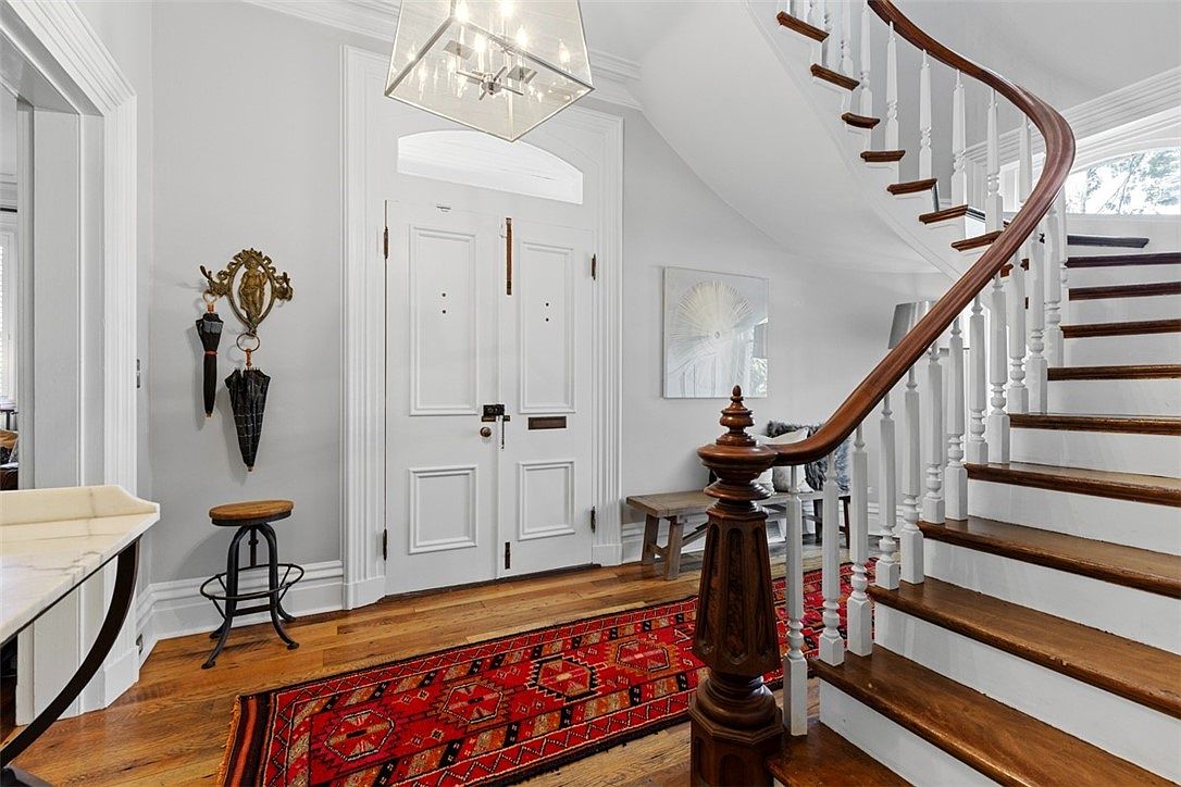 A welcoming entryway opens into the heart of the home, featuring a grand curved wooden staircase with classic white spindle railings that creates a sense of spaciousness and elegance. Warm hardwood floors extend throughout the space, complemented by a bold red patterned runner that adds color and comfort underfoot. The white front door, detailed with paneling and transom window, offers ample natural light. Family-friendly elements include a bench for sitting and organizing shoes, sturdy coat hooks beside the door, and a handy stool for convenience. Soft gray walls and a stylish glass pendant light enhance the airy, inviting atmosphere, a perfect first impression for family living.