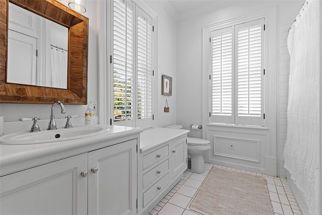 This bathroom features a fresh, bright, and welcoming design with crisp white cabinetry and walls illuminated by natural light streaming through large shuttered windows. The vanity has plenty of storage drawers and cabinets, perfect for keeping family essentials organized and out of sight. A single sink with modern chrome fixtures sits beneath a rustic wooden-framed mirror, introducing subtle warmth and contrast. The room is accented with tidy white tile flooring and a soft woven rug for comfort and safety. Its calming palette and spacious layout make it practical for families, combining functionality with an inviting, serene aesthetic.