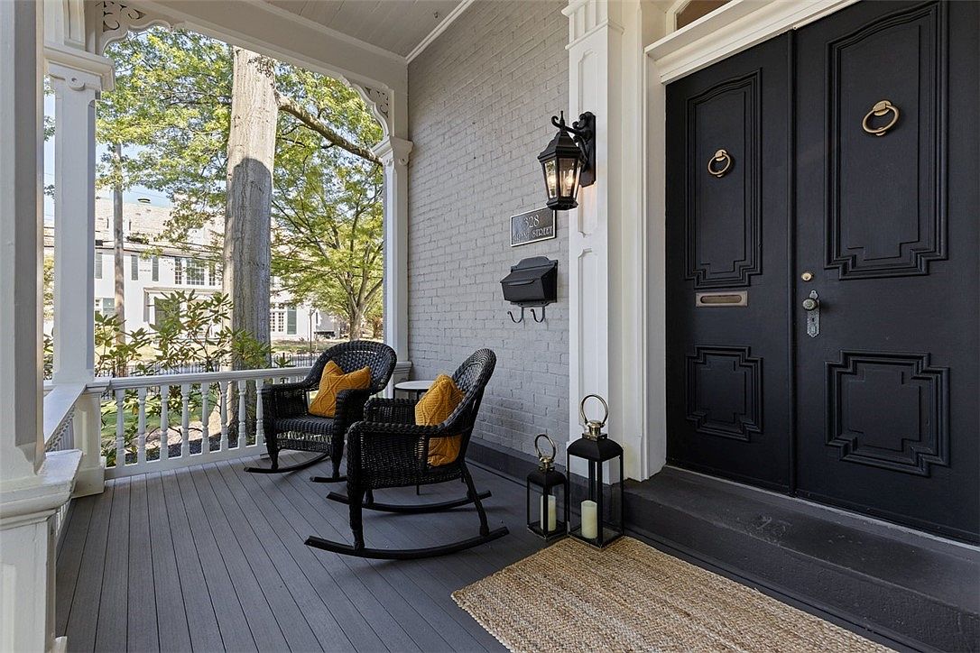 A welcoming front porch features two classic black wicker rocking chairs with bright gold throw pillows, inviting relaxation and conversation. The floor is a neutral gray, complementing the light gray brick wall and white architectural trim. The entry is accented by striking black double doors with brass knockers, flanked by black lantern-style sconces and tall candle lanterns that add a cozy touch. The white railing offers safety for children, while the open view of leafy trees and neighborhood houses creates a serene, family-friendly atmosphere perfect for enjoying quiet mornings or supervising children playing outside. A natural fiber doormat completes the look.