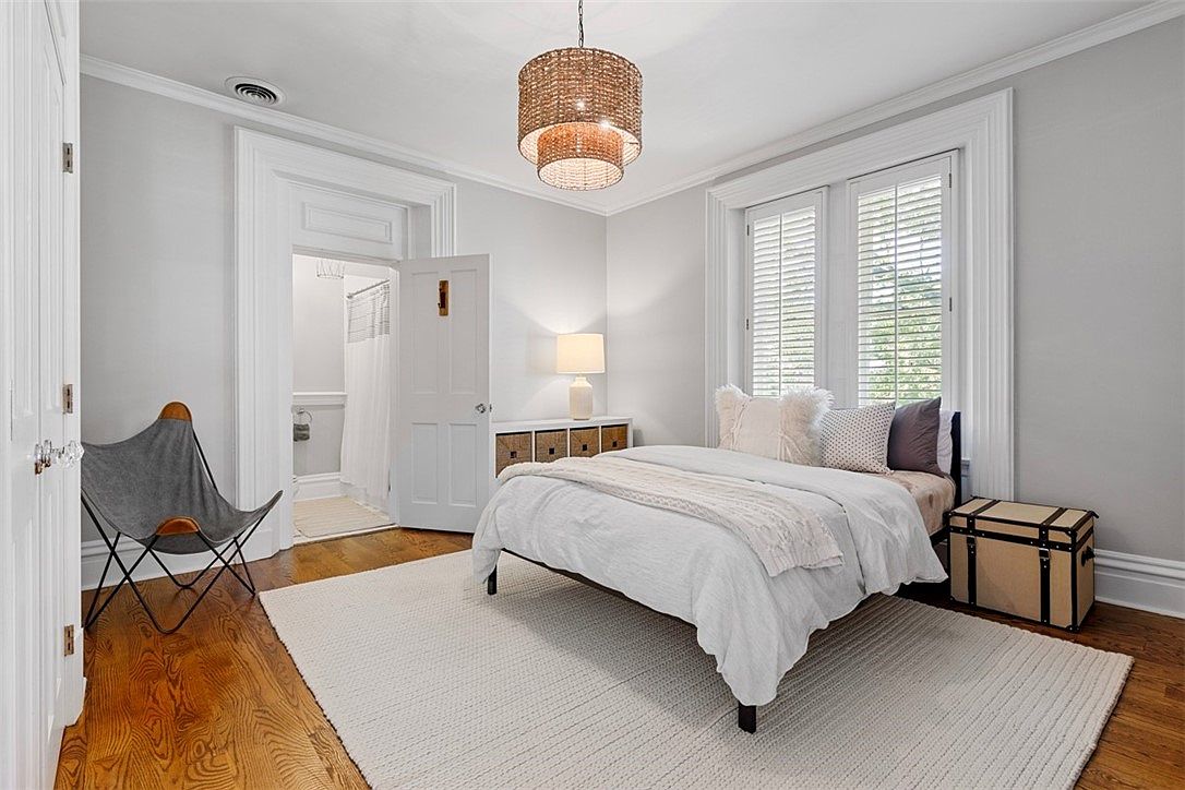 A cozy and inviting bedroom featuring a queen-sized bed with soft, neutral bedding and fluffy pillows, ideal for a restful night’s sleep. Large windows framed with white trim allow plenty of natural light, filtered through stylish plantation shutters for privacy and security, perfect for a family setting. The warm wooden floor is softened by a plush off-white area rug, making it safe and comfortable for children. A woven pendant light adds a touch of modern elegance, while the nightstand with a lamp provides practical illumination. A decorative trunk and butterfly chair offer extra seating and storage, enhancing the room’s functionality.