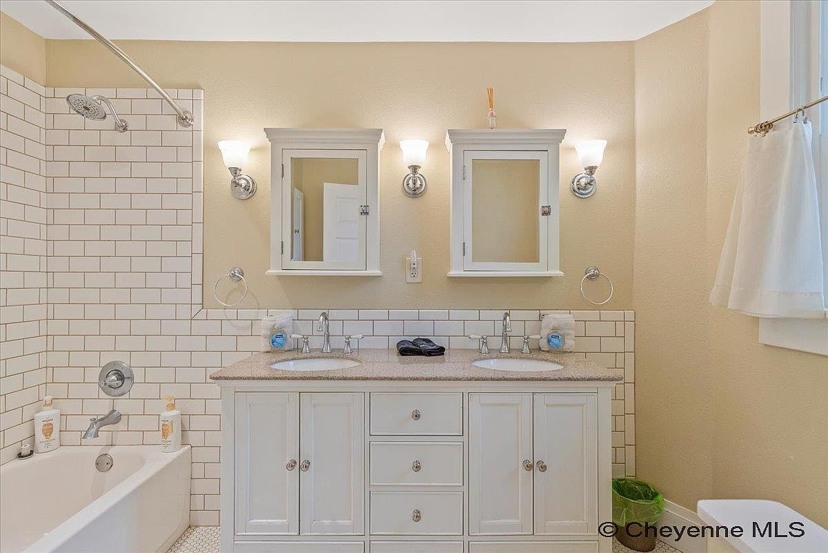 This bathroom features a practical double vanity with two sinks, making busy family mornings more convenient. Elegant white cabinets offer plenty of storage for toiletries and towels, while the cream-colored walls and white subway tile backsplash create a warm and inviting aesthetic. The bathtub, surrounded by white tile, is ideal for young children’s baths or relaxing soaks. Above the vanity, two mirrored medicine cabinets provide additional organization. Polished chrome fixtures and classic wall sconces beside each mirror enhance the room’s brightness and modern touch. A window with a delicate white curtain allows natural light, ensuring a cheerful and family-friendly space.
