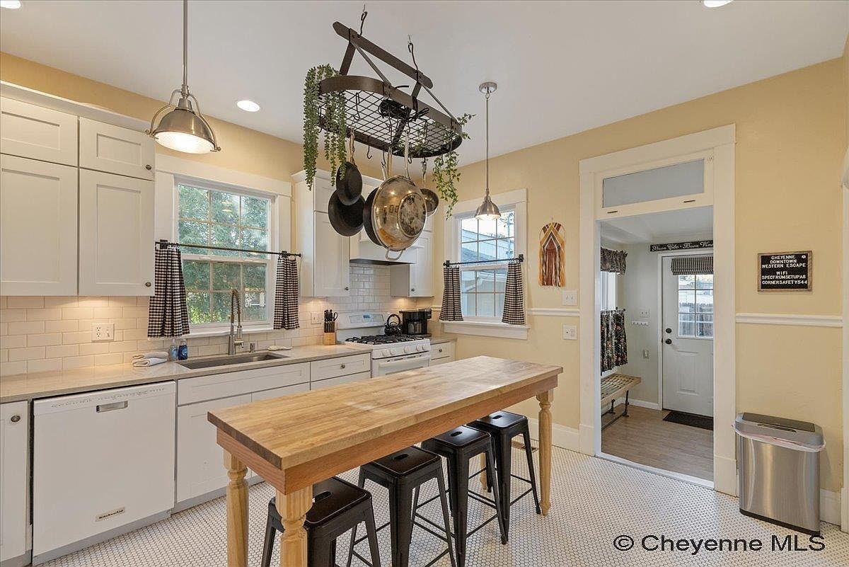 Bright, welcoming kitchen with a central wooden island offering seating for three, perfect for family meals or homework. White cabinetry lines the walls, complemented by neutral cream-colored walls and classic white subway tile backsplash. Two large windows above the sink and stove bring in natural light, each adorned with black and white gingham curtains. Overhead, a unique hanging pot rack with greenery and shiny pans adds a touch of rustic charm. Stainless steel appliances, including a dishwasher and modern fixtures, ensure convenience. The spacious layout and open sightlines to the adjacent mudroom make this space ideal for busy family life.