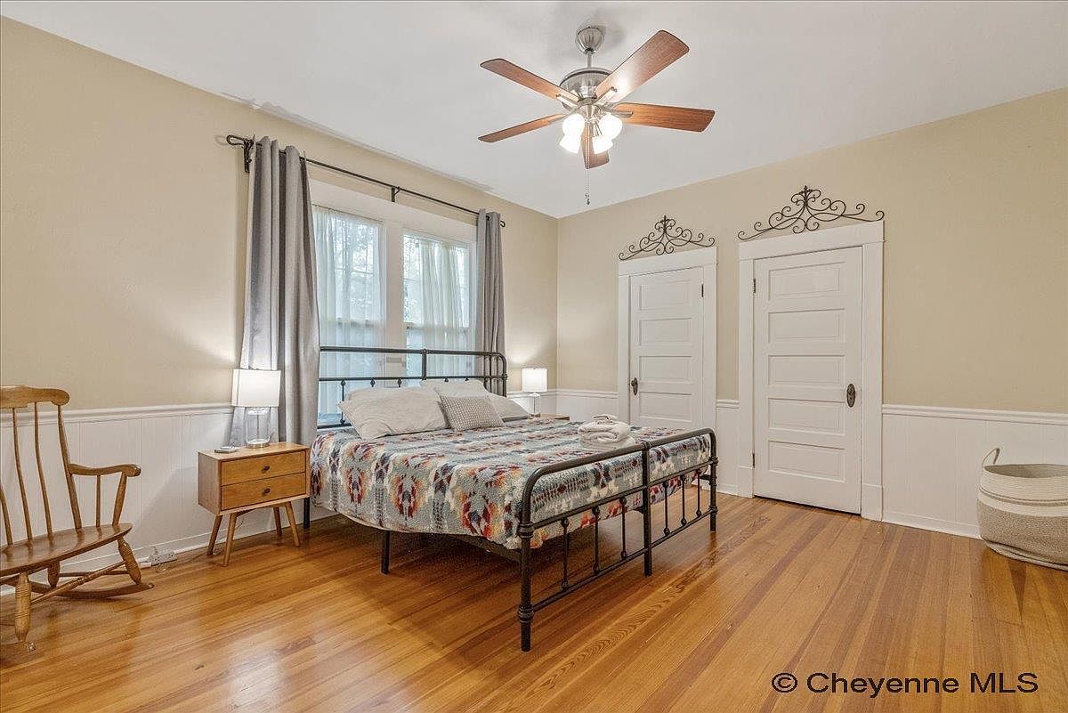 This bedroom features a warm and inviting ambiance with light tan walls, bright white trim, and natural wood flooring for a timeless, family-friendly look. A comfortable metal-frame bed rests against a wall of three large windows, letting in plenty of natural light softened by sheer curtains and cozy gray drapes. On either side of the bed, matching bedside tables and lamps provide symmetry and nighttime convenience. Thoughtful touches such as a rocking chair, a woven basket, and matching white paneled doors adorned with elegant ironwork enhance the room’s charm. The ceiling fan overhead ensures comfort and energy efficiency for families.