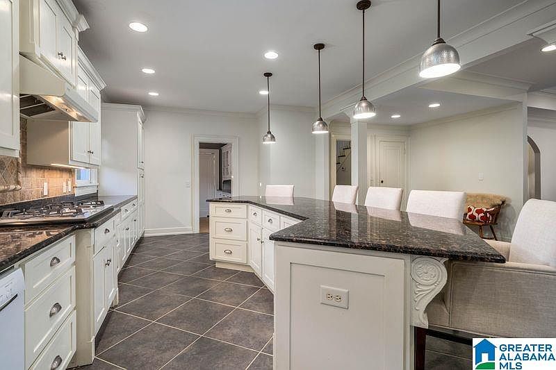 A spacious kitchen features classic white cabinetry with elegant crown molding and modern stainless steel appliances. The countertops are a polished dark stone, creating a striking contrast with the cabinetry. A large central island with ornate corbels and comfortable upholstered chairs provides seating and meal prep space. Overhead, three industrial-style pendant lights offer focused illumination alongside recessed ceiling lights. The backsplash features neutral-toned tiles set in a subtle geometric pattern, complementing the deep gray tiled floor. In the background, an open archway and wide doorway connect to adjacent rooms, maintaining an airy, open layout throughout the space.