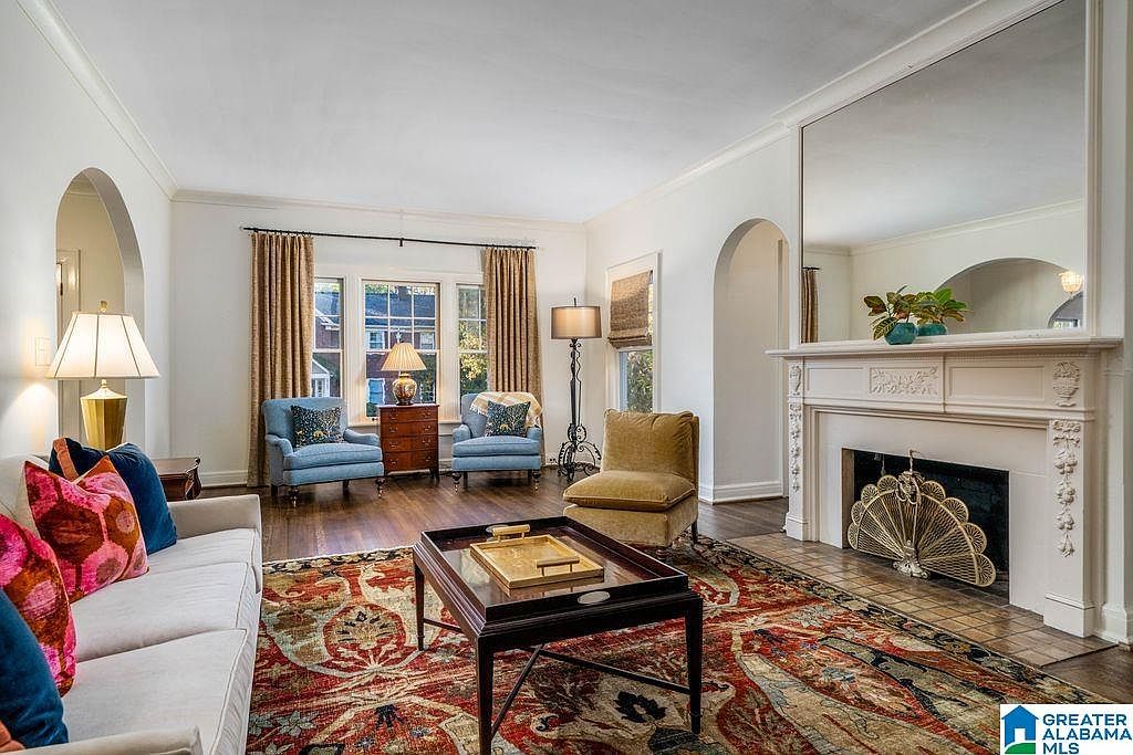 A spacious and elegant living room features rich hardwood floors and creamy white walls, complemented by arched doorway openings and crown molding. The centerpiece is a large, ornate white mantel with detailed plasterwork and a decorative brass fireplace screen, topped by an oversized wall mirror that adds brightness and depth. The seating area includes a cream-colored sofa with plush, jewel-toned pillows, a gold velvet armchair, and two light blue upholstered chairs flanking a chest with a table lamp. Gold drapes frame the front windows, and a richly patterned area rug brings warmth and color to the room.