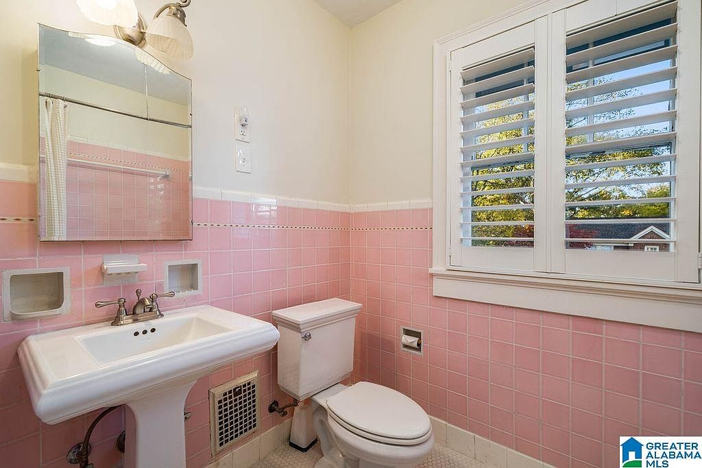A compact bathroom with vintage design elements, featuring pastel pink tile wainscoting with a subtle white trim and cream upper walls. The white porcelain pedestal sink stands beneath a mirrored medicine cabinet with retro chrome fixtures. The toilet is positioned beside the sink, and above it is a double window with classic white plantation shutters, letting in natural light and offering a view of leafy trees outside. Additional touches include an old-fashioned wall vent, built-in soap holders in the wall, and a decorative wall sconce with glass shades, contributing to the charming, midcentury feel of the space.