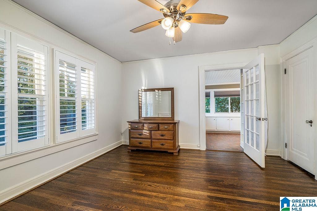 This space features rich, dark hardwood floors that contrast elegantly with the crisp white walls and trim, giving the room a clean and classic feel. Three large windows with plantation shutters line one wall, allowing ample natural light to filter in. A wooden dresser with a matching mirror adds warmth and character to the space. Overhead, a ceiling fan with light fixtures and natural wood blades provides both illumination and ventilation. French doors with glass panes open to an adjoining room, visually connecting spaces and enhancing the sense of openness while maintaining a sense of timeless style.