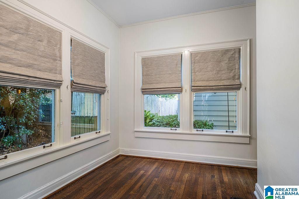 A cozy, small room featuring three large windows with beige Roman shades that allow filtered natural light to enter the space. The walls are painted a soft white, providing a neutral backdrop that enhances the feeling of brightness and openness. Warm, medium-toned hardwood floors add a touch of classic charm and complement the simple white baseboards. Outside the windows, views of lush greenery and a board fence create a sense of privacy and tranquility. Clean lines and uncluttered surfaces suggest a versatile space that could serve as a reading nook, breakfast area, or small home office.