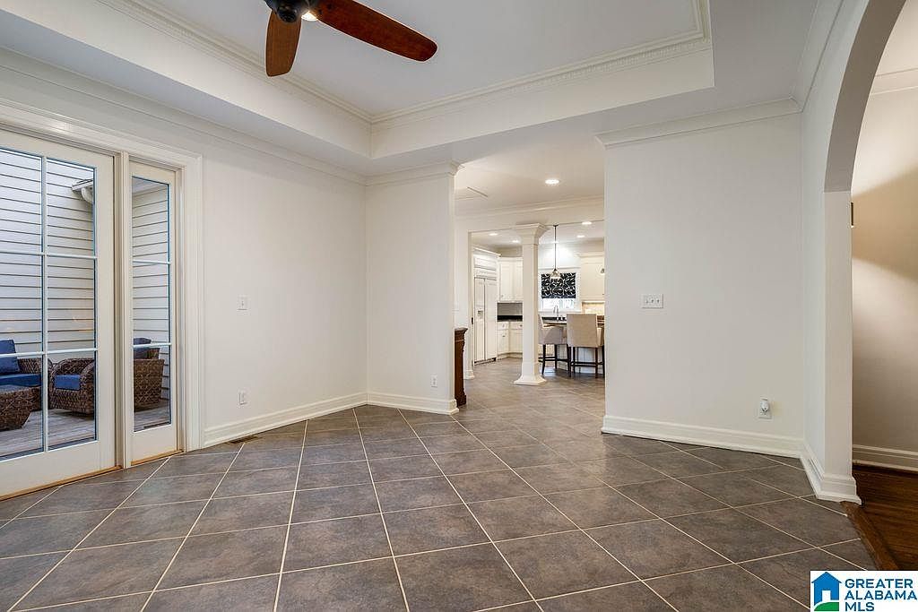 Spacious open area with dark, large-format square tiles arranged in a grid pattern on the floor, framed by elegant white baseboards and crown molding. Double glass French doors lead out to a cozy patio with wicker seating visible through the panes. The space features high, tray ceilings with recessed detail and a wooden ceiling fan with dark blades. To the right, a wide arched doorway leads elsewhere, while directly ahead, the room opens to a bright kitchen area with white cabinetry, a central kitchen island, and plush dining chairs, illuminated by recessed ceiling lights.