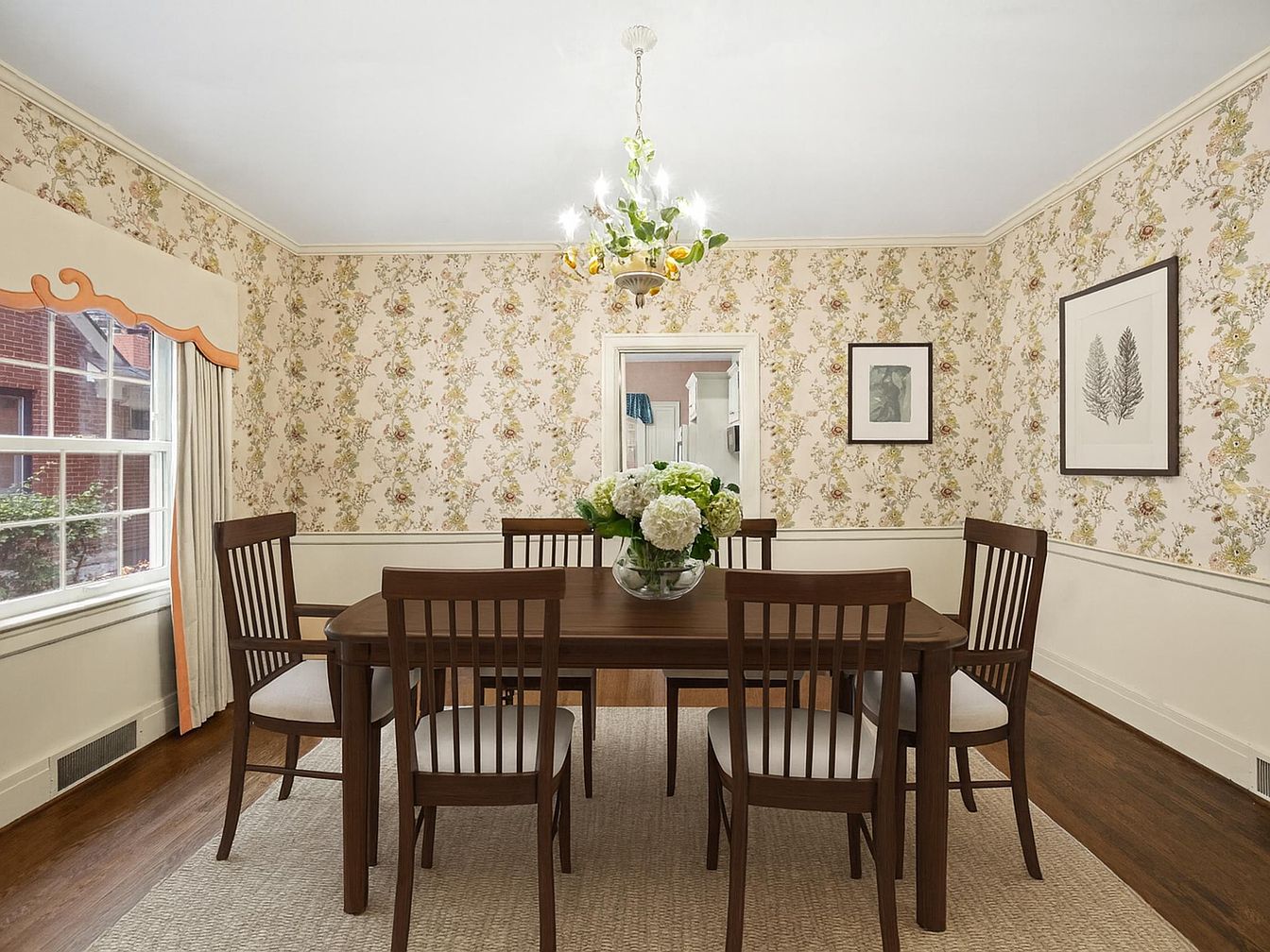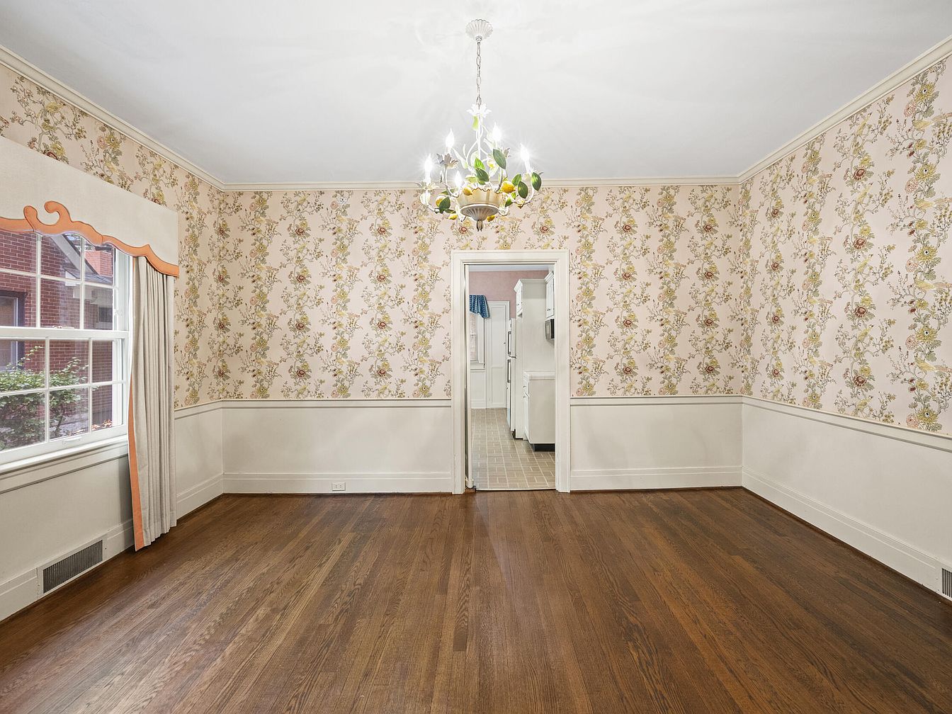 This dining room features elegant floral wallpaper in soft pastel hues of pink and cream, enhancing its vintage charm. A distinctive chandelier, adorned with green accents, hangs centrally from the ceiling, offering a touch of opulence. The hardwood flooring reflects a rich, warm tone, contrasting beautifully with the lighter walls. Curtains frame the large window, allowing natural light to flood the space, while the wainscoting adds an architectural element at the room’s base. A doorway leads to the adjacent kitchen, emphasizing the open layout, ideal for entertaining. Overall, this setting exudes a timeless, welcoming atmosphere.