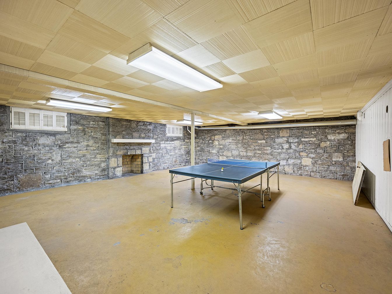 A spacious basement area featuring a functional layout suitable for recreational activities. The flooring is a simple yellow concrete, contrasting the rugged texture of the exposed stone wall that offers character to the space. High ceilings enhance the openness, illuminated by fluorescent lights mounted in a grid pattern. A ping pong table occupies the center, providing a focal point for leisure. An unused brick fireplace adds a touch of warmth to the otherwise utilitarian design. Additional windows along the walls contribute natural light, balancing the darker elements of stone and concrete with brightness for a lively ambiance.