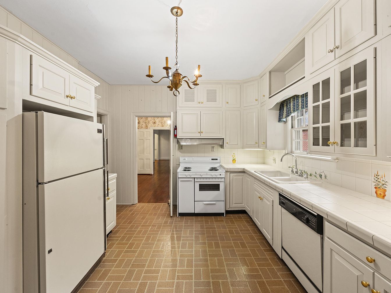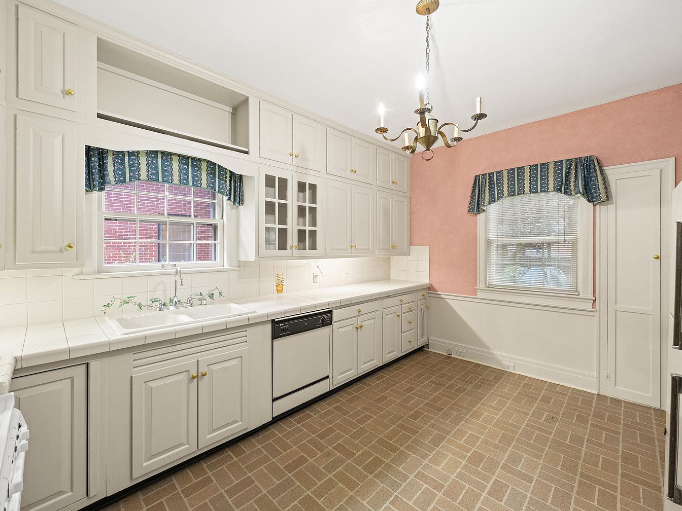 A traditional kitchen featuring a layout conducive to both cooking and socializing. The cabinetry is painted a soft white with elegant gold hardware, offering ample storage and a classic charm. A large window with a patterned blue and green valance provides natural light, complementing the pink walls that add warmth to the space. The countertop, finished in white tiles, contrasts with the earthy, textured brick-patterned flooring. A chandelier hangs from the ceiling, adding a touch of sophistication. Overall, the space harmonizes functionality with timeless design elements, creating an inviting atmosphere for family gatherings.