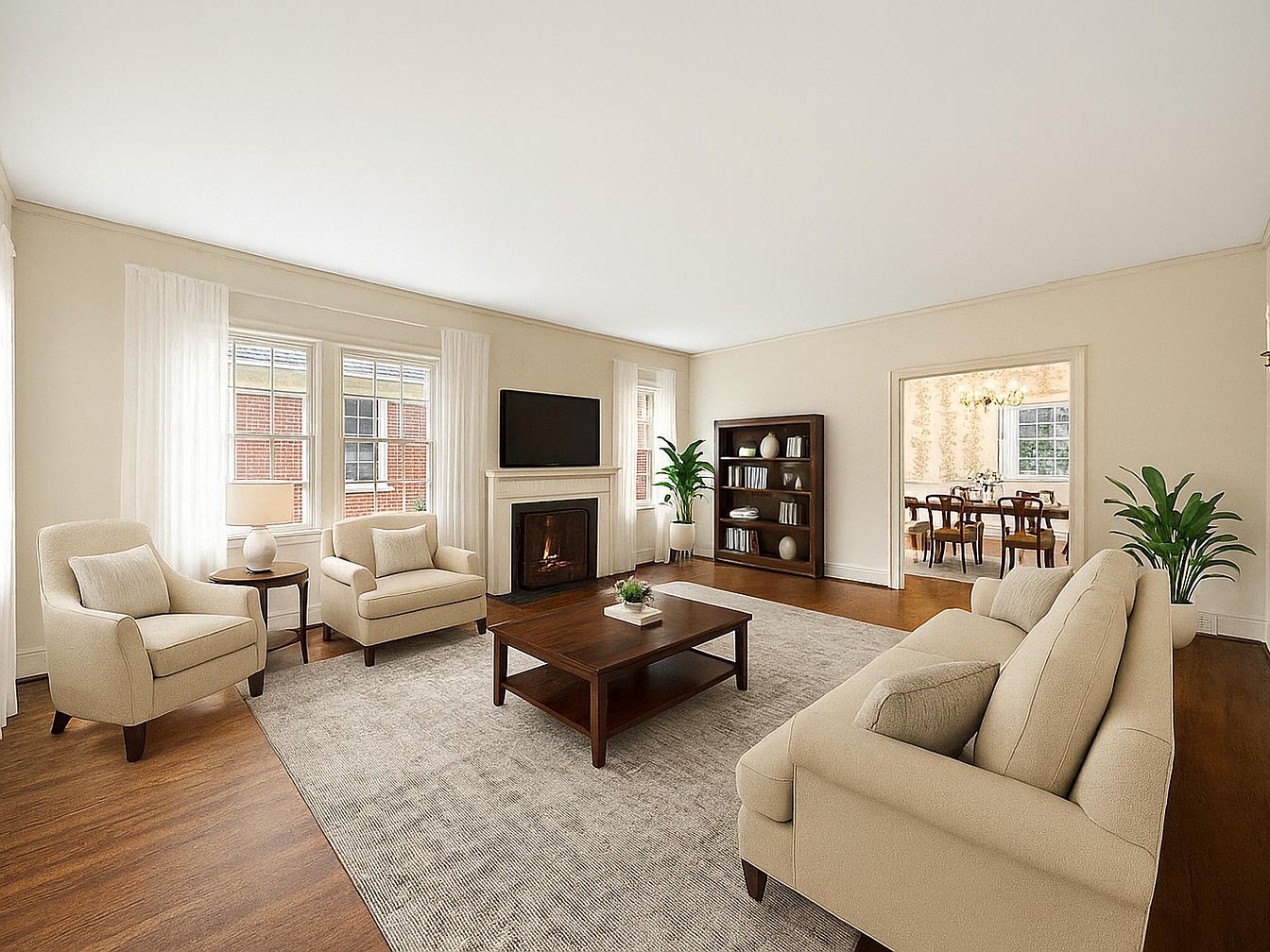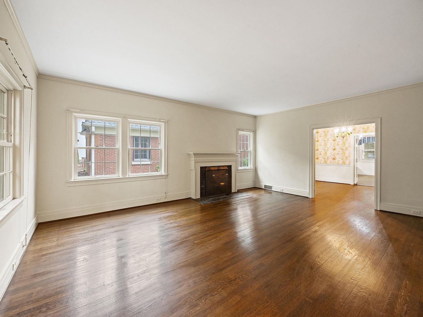 A spacious living room features a clean layout with beautiful hardwood flooring that adds warmth. The walls are painted a soft cream, enhancing natural light flowing through large windows, lined with classic white trim. At the center, a traditional fireplace with a white mantel offers a focal point, enhancing the room’s charm. An archway leads to an adjoining room, its floral wallpaper hinting at vintage aesthetics. The ceiling is simple, painted white, and enhances the room’s openness. Minimalistic furniture would suit this space, allowing for a comfortable and inviting atmosphere that suggests both elegance and warmth.