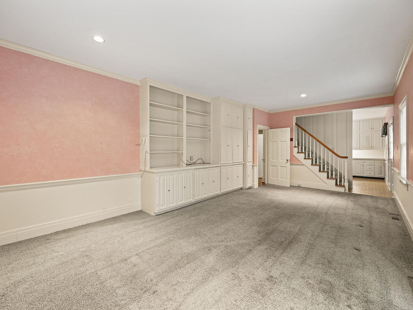 The space features soft, pale pink walls accented with white wainscoting, creating a warm and inviting atmosphere. A built-in shelving unit spans one side, offering ample storage and display options. The carpeted flooring is plush, inviting comfort, while natural light pours in through large windows, enhancing the room’s brightness. Opposite the built-in unit, a doorway leads into the kitchen, visible with pale cabinetry that complements the overall aesthetic. A gracefully curved staircase with a wooden banister adds architectural interest and directs flow into the upper levels. This layout balances openness with defined areas for usage.