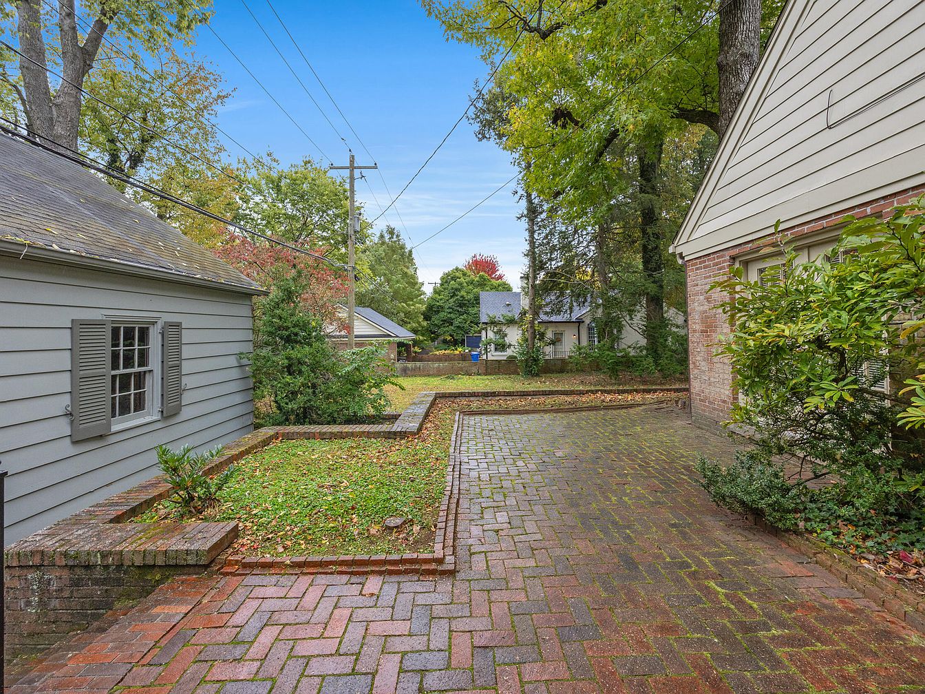 A quaint, brick-paved patio area, surrounded by lush greenery. The bricks create a rich texture, featuring a mix of earthy tones that harmonize with the soft grey siding of the nearby house. A small raised garden bed is visible on the left, showcasing patches of vibrant green grass. Framed by mature trees, this outdoor space offers a serene, inviting feel. The architecture includes vintage-style shutters on the window, adding to the historic charm. A clear blue sky peeks from above, enhancing the tranquil ambiance, while fallen leaves suggest the onset of autumn.