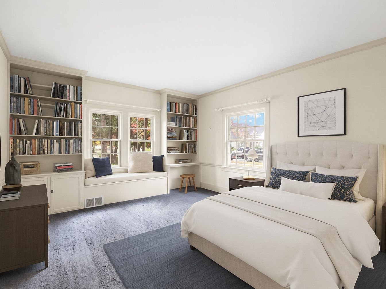 A cozy bedroom with a serene atmosphere showcases a neutral color palette of soft beige and warm greys. A plush, upholstered bed with a tufted headboard is accented by decorative pillows in various textures, creating a welcoming focal point. Natural light floods in through two large windows flanked by simple drapes, enhancing the inviting feel. Built-in bookshelves filled with books line one wall, while a comfortable window seat offers a perfect reading nook. The room features a plush rug underfoot, complementing the overall warm tones and wooden furniture, including a nightstand and a small chair, ensuring comfortable functionality.