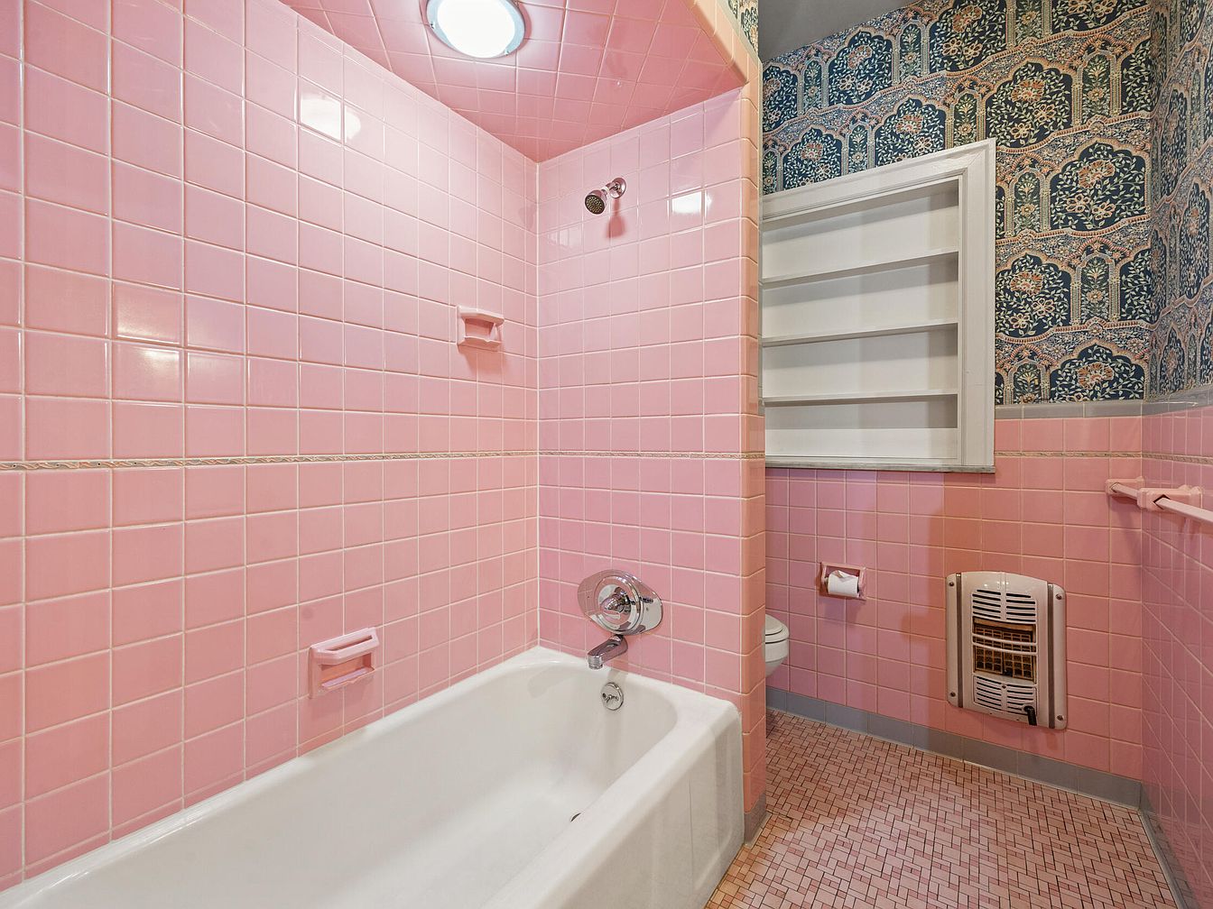 A vintage bathroom features a vibrant pink tile scheme, creating a lively atmosphere. The walls are adorned with glossy pink square tiles, extending to the ceiling. Complementing the tiles, a patterned wallpaper in deep blue and floral motifs adds a striking contrast above the bathtub area. A white bathtub serves as the focal point, alongside a sleek chrome shower fixture. Light-colored grout highlights the tile layout, while the floor showcases smaller pink mosaic tiles, enhancing a retro feel. A built-in shelf and a heater add practical touches, contrasting next to delicate, pink towel bars.