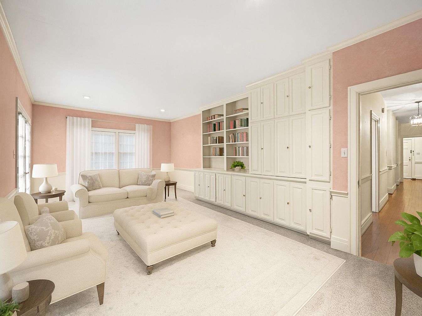 A comfortable living room features soft beige upholstery on a large sofa and armchairs, creating a serene atmosphere. The walls are painted a muted pink, complemented by natural light filtering through sheer white curtains. A tufted ottoman anchors the space, offering both style and functionality. Flourishing greenery adds a touch of life, strategically placed beside a dark wood end table. Built-in cabinetry along the wall, painted in white, is filled with books and decorative items, providing both storage and visual interest. The light-colored carpet enhances the cozy feel, while warm wooden flooring leads to adjacent rooms.