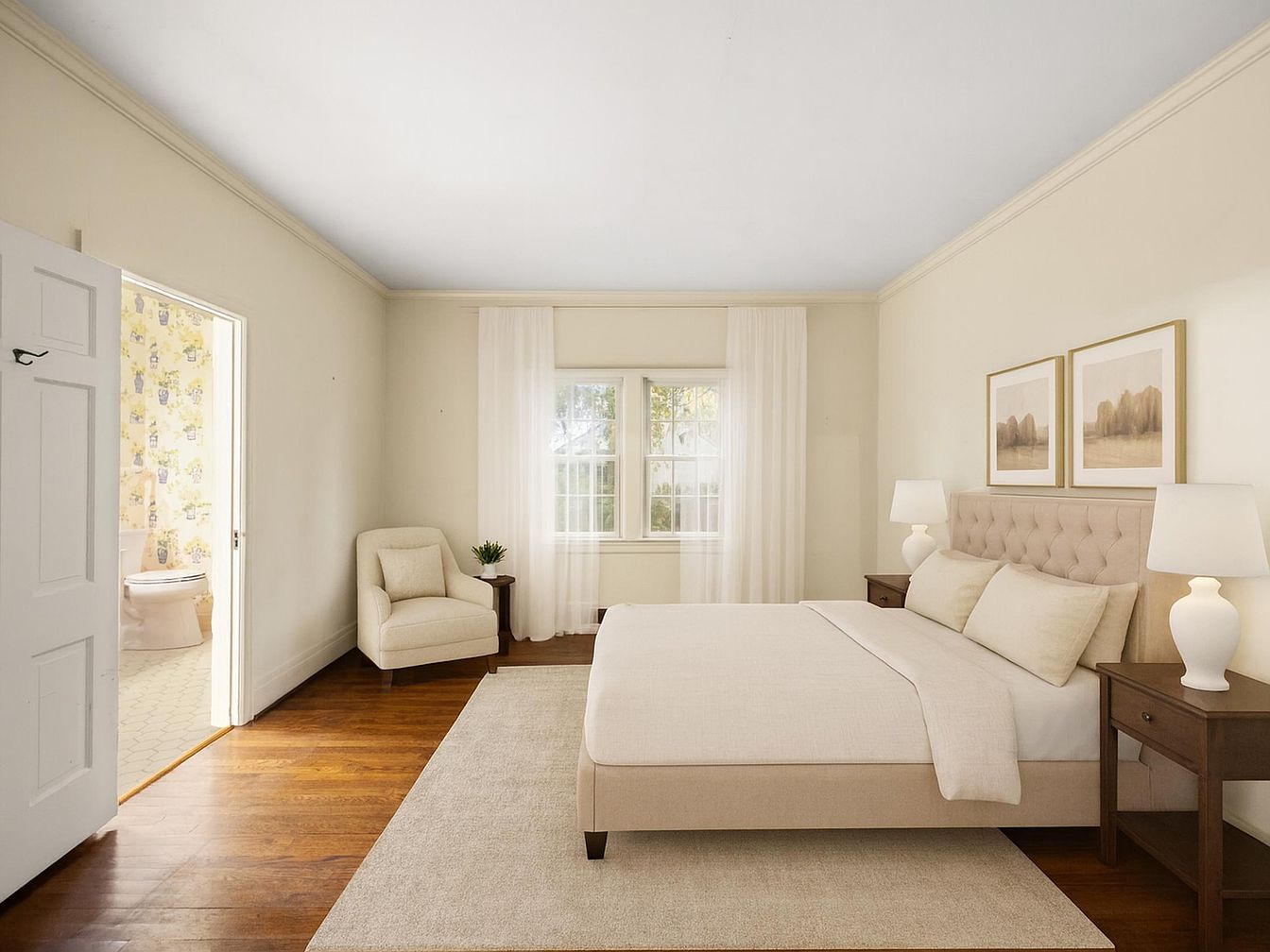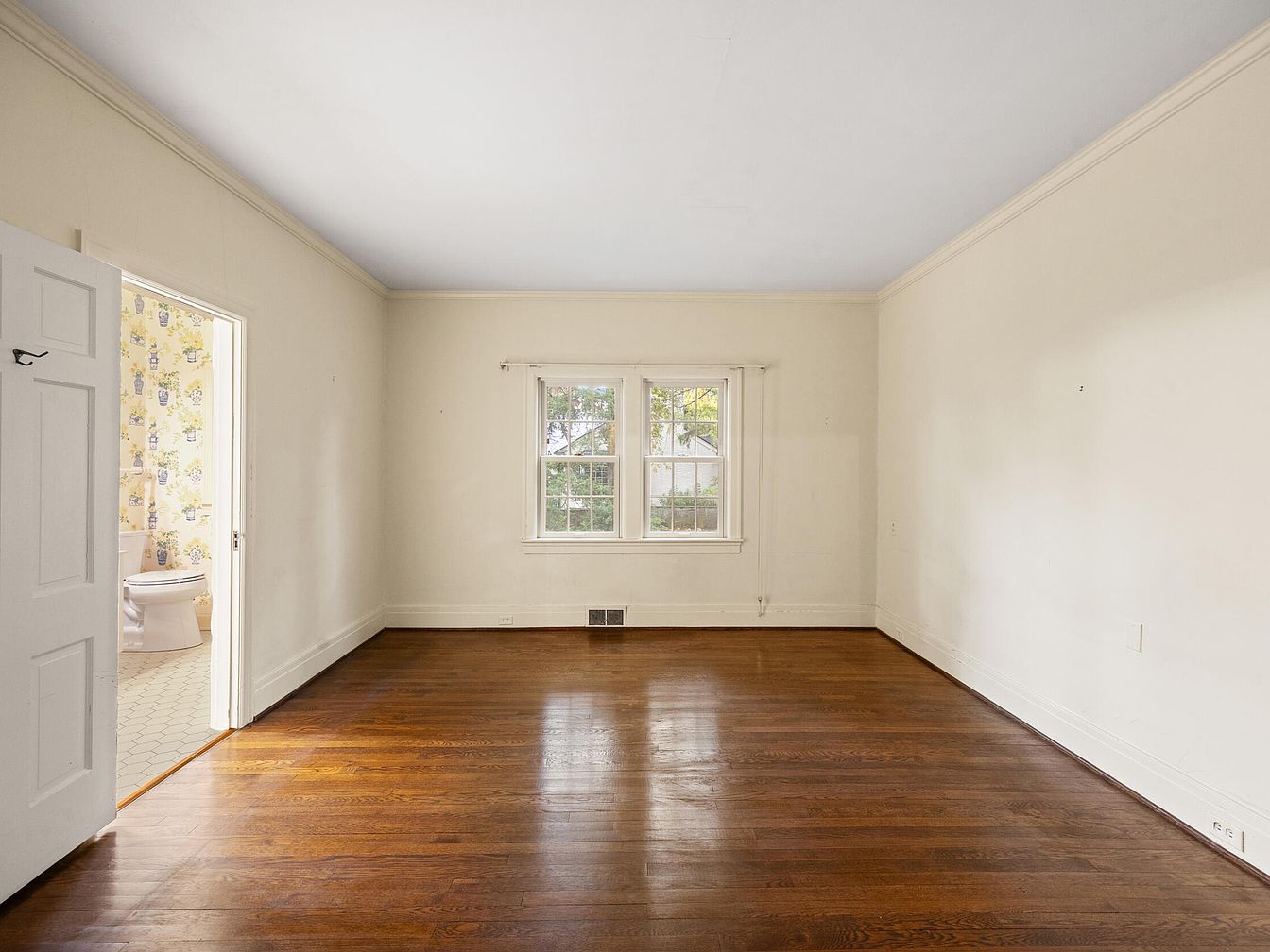 The room features warm hardwood flooring that adds a rich, inviting ambiance. Light beige walls create a soothing backdrop, complemented by white trim along the ceiling and windows. A prominent window allows natural light to fill the space, showcasing views of the outdoors. To the left, an open door reveals a bathroom with a cheerful floral wallpaper, hinting at a vintage style. The layout accommodates versatile furniture placement, perfect for a cozy bed and side tables. The simplicity of the room design creates an airy feel, evoking a sense of calm and potential for personalization.