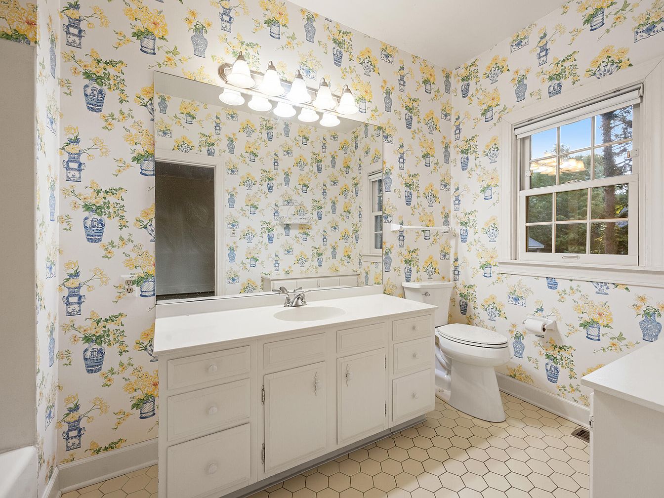 The bathroom features a bright and cheerful floral wallpaper, showcasing yellow flowers and blue vases that enhance the space’s charm. A white countertop with a classic faucet is accompanied by simple cabinetry below, providing a clean and spacious feel. A large mirror reflects light, creating an airy atmosphere, while a row of six pendant lights illuminate the area effectively. The hexagonal tile flooring adds texture and a vintage touch. Natural light streams through a well-framed window, complementing the light color palette. A white toilet is discreetly positioned, maintaining a tidy aesthetic.