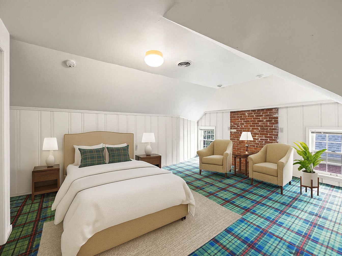 This attic bedroom features a cozy yet modern design. The sloped ceiling and white-washed wood paneling impart a rustic charm. A plush queen-sized bed with beige upholstery offers a soft focal point, adorned with plaid accent pillows. Flanking the bed are two wooden nightstands, each with stylish table lamps providing warm lighting. A rich, plaid-patterned carpet in shades of teal, green, and red contrasts with the neutral decor, enhancing the space’s warmth. Two beige armchairs and a small side table create a reading nook near a brick accent wall, while natural light pours in through adjacent windows.