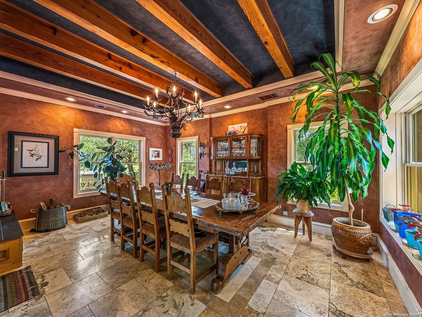 This dining area features a robust rustic aesthetic, highlighted by a large wooden dining table with a sturdy base surrounded by eight matching wooden chairs. Warm, textured terracotta walls create an inviting backdrop, complemented by a natural stone floor in neutral tones with subtle marbling. The ceiling boasts exposed wooden beams contrasted against a darker, textured surface, lending architectural interest and depth. A wrought-iron chandelier hangs centrally, casting ambient light. Large windows bring in ample natural light and fresh greenery from several potted plants adds vibrancy and life to the space. Classic wooden cabinetry with glass doors provides elegant storage while contributing to the room’s traditional charm.