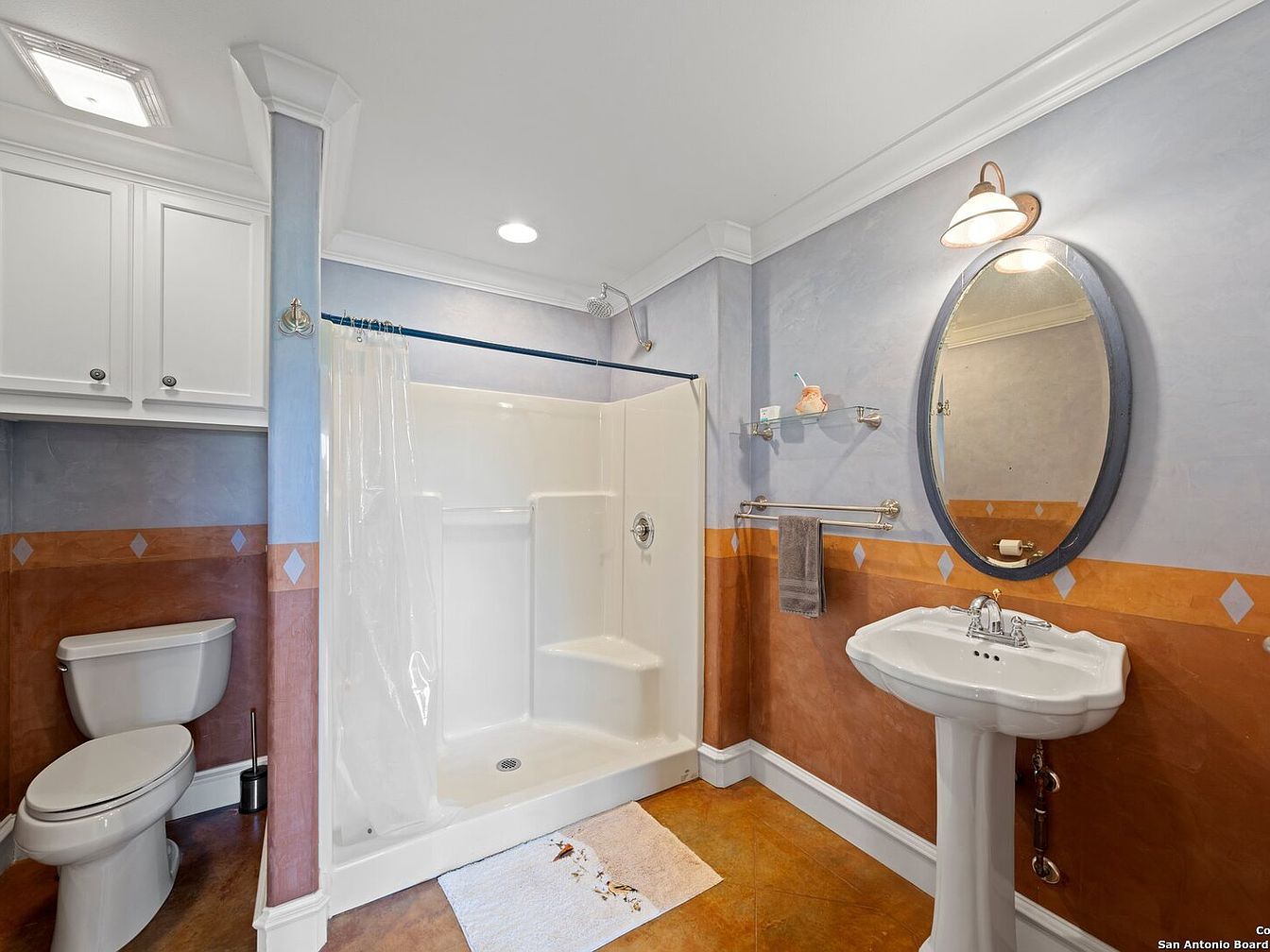 This bathroom combines functionality with a warm and inviting design. The room features a corner shower with a built-in seat and a clear shower curtain, adding a practical element to the space. The walls are painted in a two-tone style: the lower half in a rich terracotta hue adorned with gray diamond accents, and the upper half in a soft, muted blue, creating a harmonious contrast. A white pedestal sink with classic molding is paired with an oval mirror encased in a dark frame, topped with a vintage-style wall sconce. The white toilet is tucked beside a half-wall separating it from the shower. The floor has a subtle stained or polished concrete look that complements the warm tones of the walls. White cabinetry above the toilet adds storage without crowding the space. Overall, the design balances rustic warmth with clean, classic fixtures.
