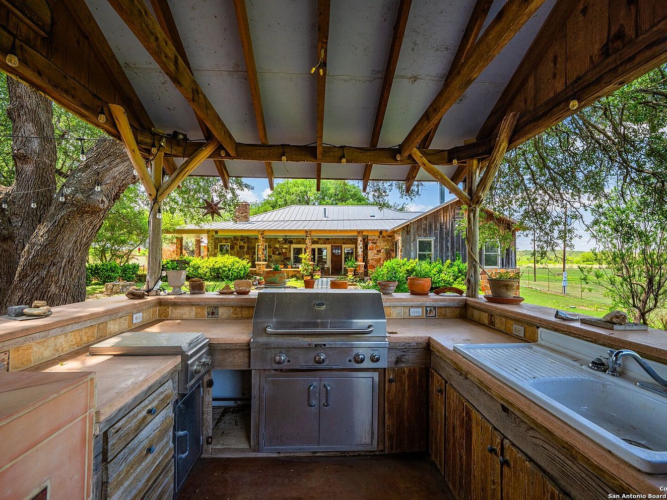 This outdoor kitchen is nestled under a rustic wooden pergola with exposed beams and supports, creating a cozy and inviting cooking space. Natural wood tones dominate the design, with a mix of weathered cabinetry and tiled countertops that provide ample workspace. A stainless steel gas grill anchors the central area, flanked by additional appliances and a white farmhouse-style sink on the right. The open layout allows for stunning views of vibrant greenery and a stone house beyond, blending indoor-outdoor living with a charming rural aesthetic. Small potted plants and string lights add warmth and character.
