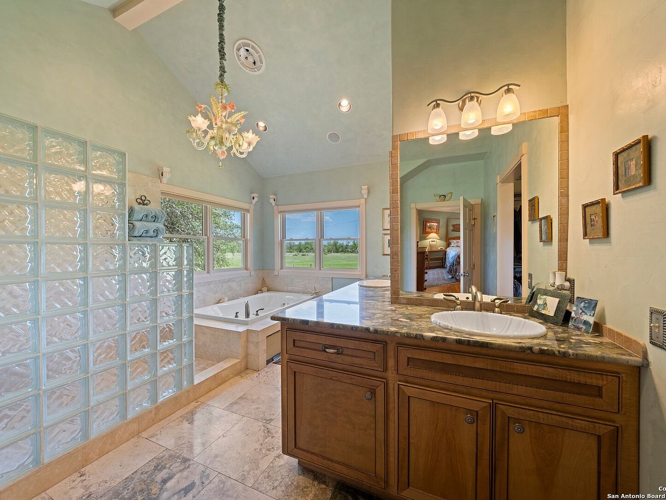 This master bathroom blends elegance and comfort with soft muted tones. The room features a spacious vanity with warm wooden cabinets topped by a polished granite countertop housing dual sinks. A large mirror with subtle tile border reflects natural light pouring in from multiple windows, creating a bright and airy atmosphere. The bathtub is inset in a tiled surround with steps for easy access, positioned near windows offering serene outdoor views. A stylish glass block wall provides partial separation, maintaining openness. The room is completed by a delicate chandelier, recessed lighting, and tasteful wall art, all contributing to a tranquil, sophisticated space.