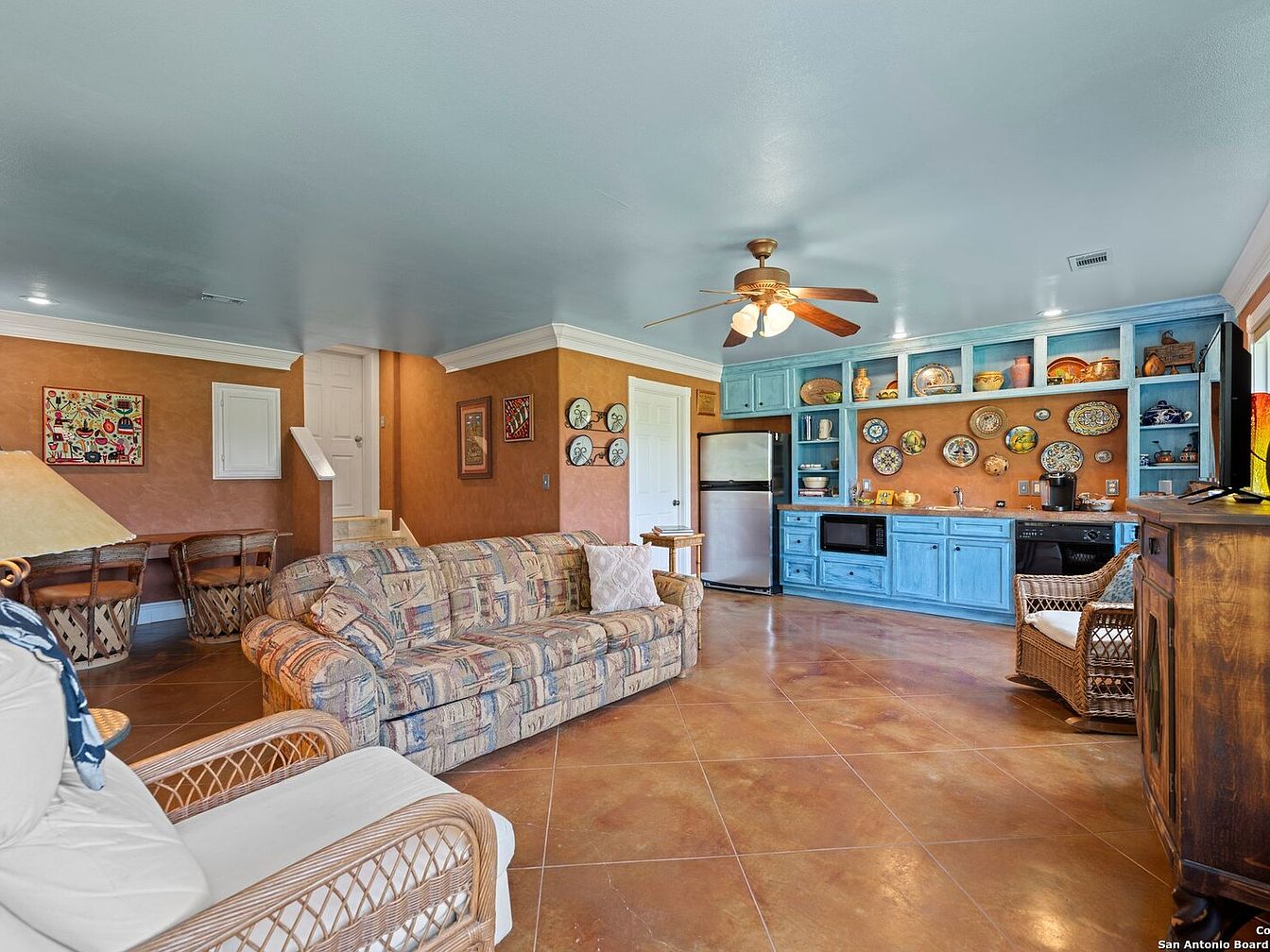 This open-concept living area combines a cozy sitting space with a compact kitchen. Earthy brown tile flooring and warm terracotta-hued walls create a grounded, rustic ambiance. The ceiling contrasts in a soft, cool light blue, enhancing the room’s spacious feel. A vibrant blue built-in kitchen cabinetry features open shelving adorned with colorful pottery and plates that add a cheerful, handcrafted touch. The furniture includes a patterned fabric sofa and a wicker armchair with white cushions, emphasizing comfort and natural textures. Ceiling fan lighting and eclectic wall art contribute to the inviting, homey atmosphere.