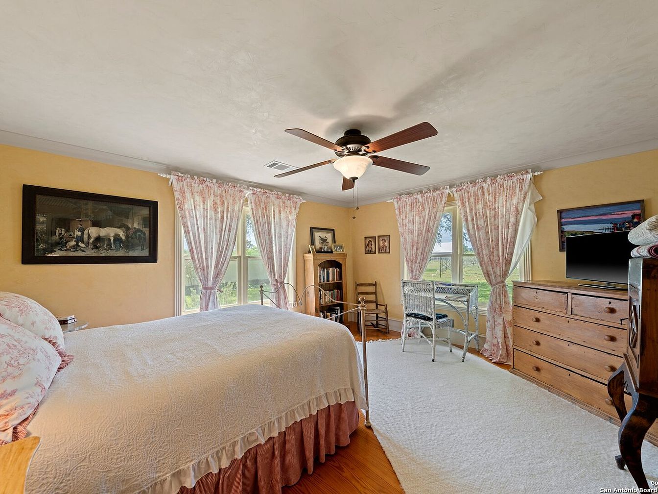This inviting bedroom features warm yellow walls and soft natural light streaming through three windows adorned with floral pink and white curtains. A white metal-framed bed dressed in a quilted white coverlet and ruffled bed skirt anchors the space. Hardwood flooring complements the antique wooden dresser and coordinating bookshelf, adding rustic charm. A white wicker desk and chair provide a quaint workspace. Artwork featuring horses and scenic views enhances the cozy, pastoral ambiance. The ceiling fan with wooden blades adds a practical yet classic touch to the room’s comfortable and timeless decor.
