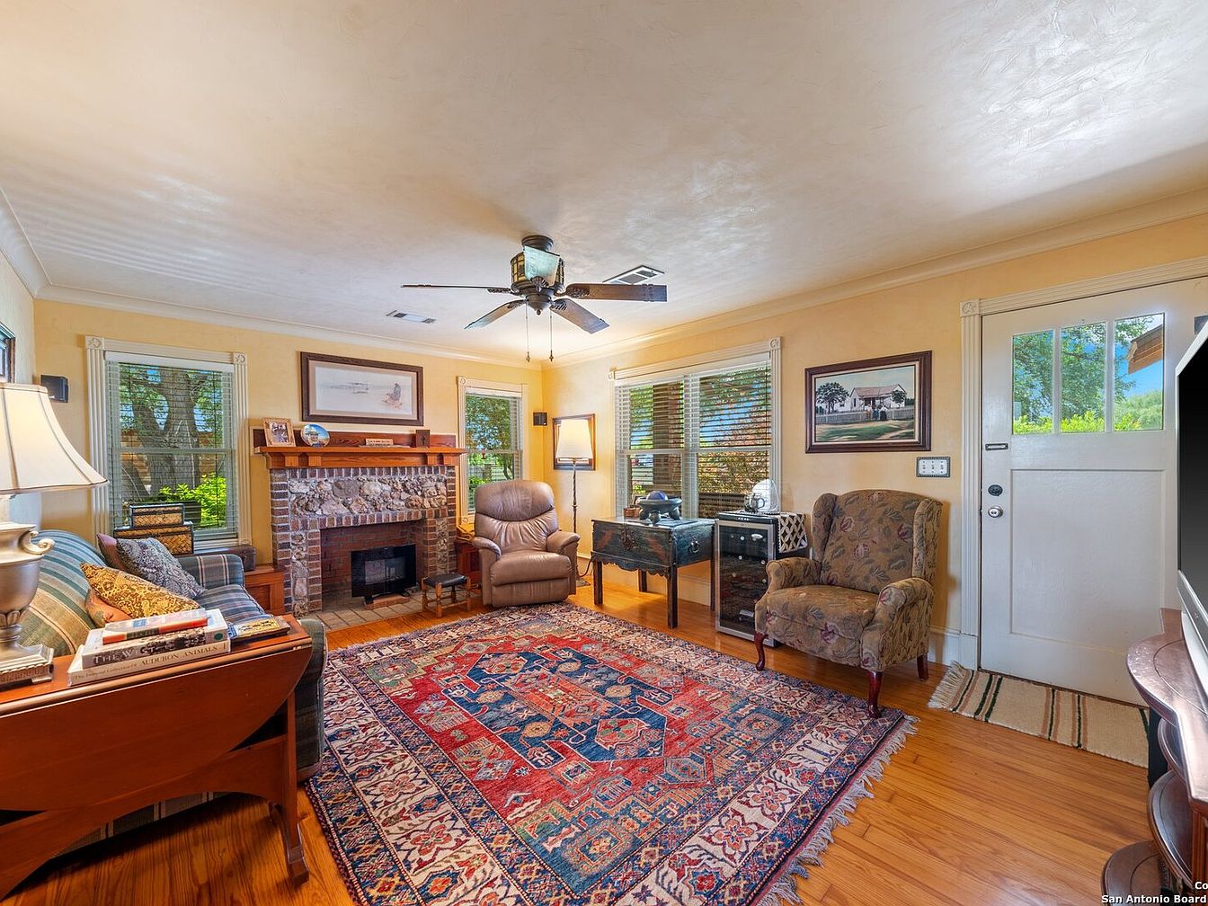 This inviting living room features a warm color palette with soft yellow walls complementing the rich wood flooring. A prominent stone and brick fireplace, framed by two windows with white molding, anchors the space and adds rustic charm. The room is furnished with a patterned sofa, leather recliner, and floral upholstered armchair, arranged around a vibrant, intricately patterned area rug in reds and blues. Natural light pours through multiple windows, brightening the space, while a ceiling fan adds a classic touch. The decor showcases a blend of traditional and cozy elements, with art and accessories enhancing the homey ambiance.
