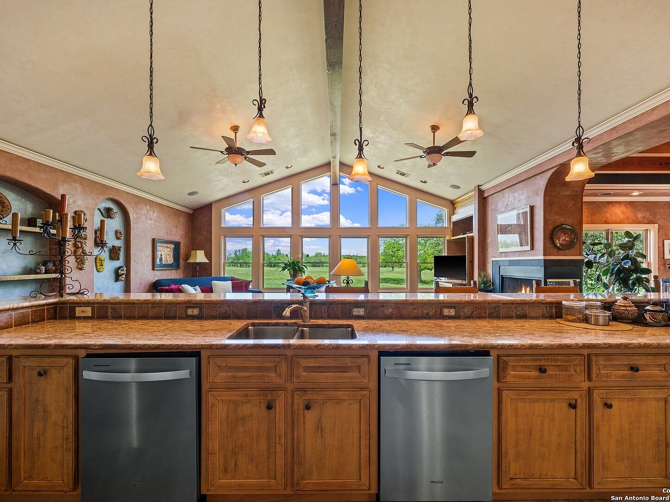 This kitchen features a warm, rustic design with wooden cabinetry and a wide, tiled countertop that doubles as a breakfast bar. Two stainless steel dishwashers sit below the counter, and a central sink provides convenience. Overhead, pendant lights with wrought iron chains add a vintage charm, while ceiling fans enhance airflow in the vaulted ceiling space. The kitchen opens directly into a spacious living area highlighted by a large wall of windows with a triangular peak, offering stunning natural views and abundant daylight. Earthy tones and textured walls create a cozy, inviting atmosphere.