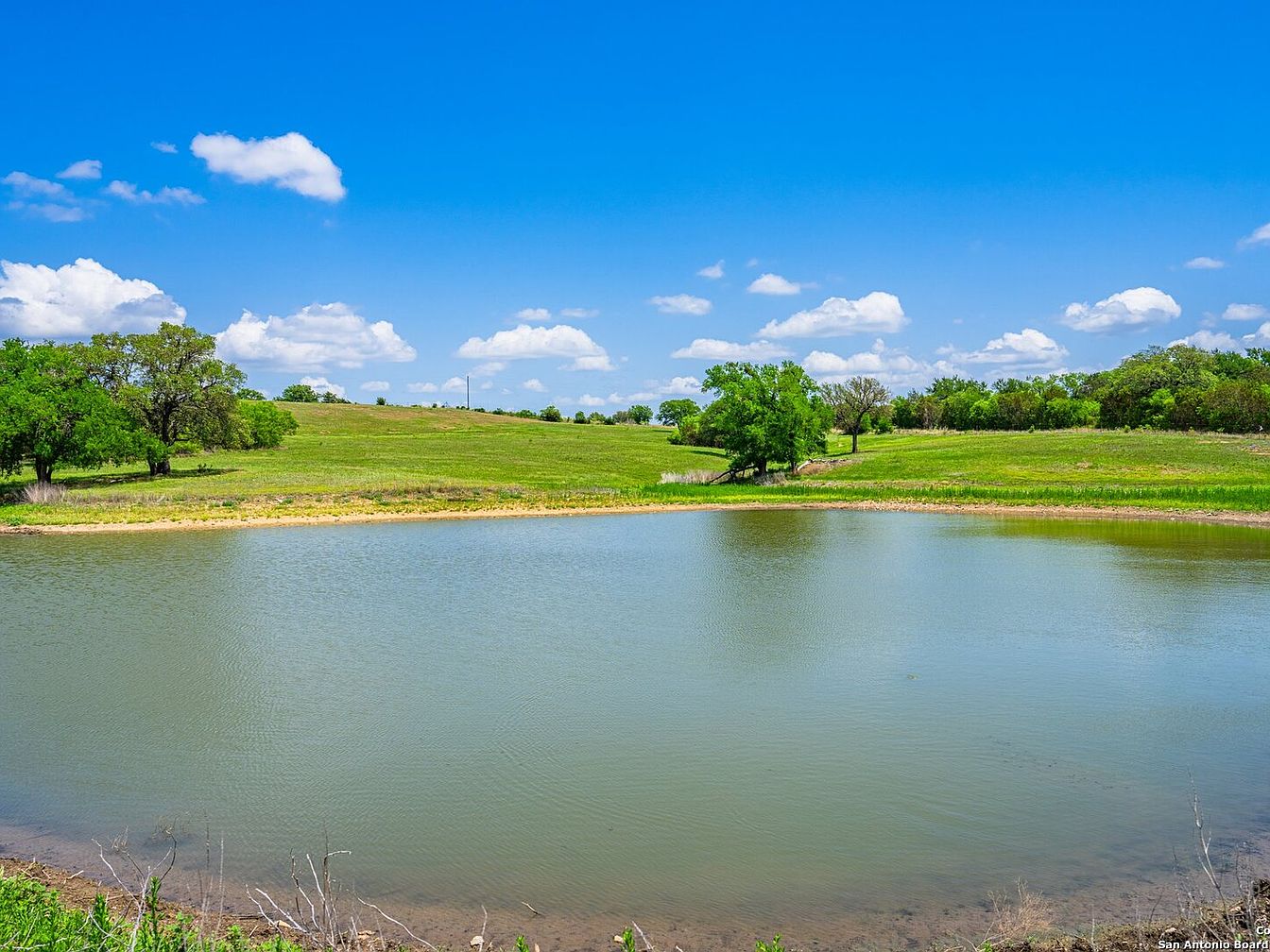 This serene outdoor scene features a tranquil pond bordered by grassy banks and sparse natural vegetation. The gently rippling water reflects the expansive blue sky dotted with fluffy white clouds, creating a peaceful atmosphere. Surrounding the pond is rolling green pastureland with scattered mature trees, evoking a sense of openness and rural charm. The landscape suggests a pastoral setting ideal for relaxation or outdoor activities. This view highlights natural beauty and quietude, making it an attractive feature of the property for those seeking countryside tranquility in a spacious environment.