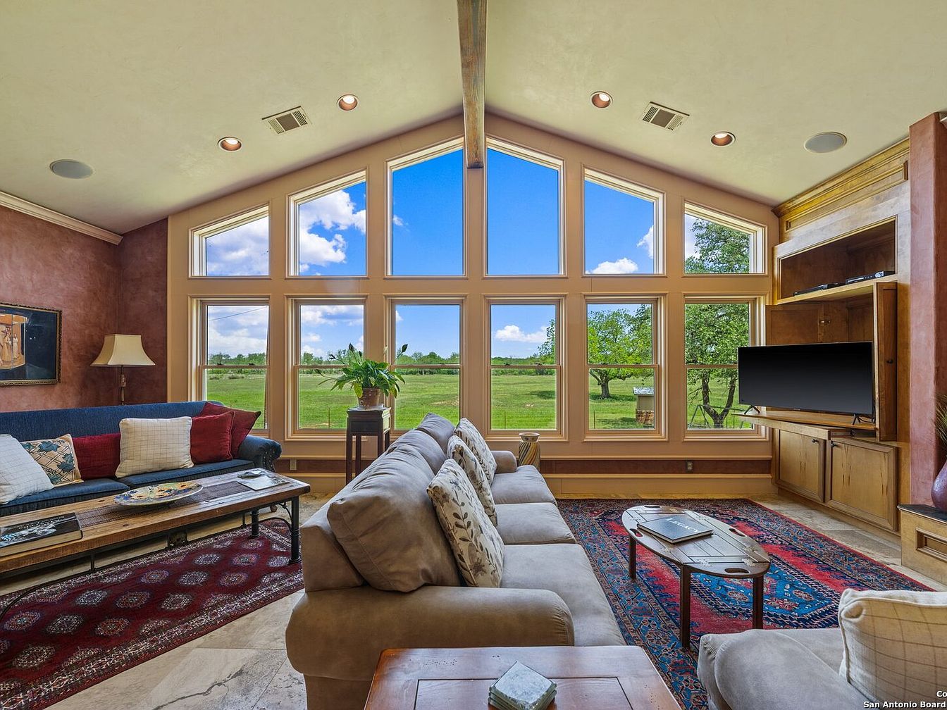 This living room features a dramatic vaulted ceiling with a central wood beam, complementing the warm beige walls and rich accents. A large wall of windows with varying shapes allows abundant natural light and offers sweeping views of lush green fields beyond, creating an inviting indoor-outdoor connection. Comfortable seating includes a beige sectional and a navy blue couch adorned with patterned, red, and neutral pillows. Decorative area rugs with intricate patterns introduce warmth and texture, while wooden built-in cabinetry houses a flat-screen TV and adds practical storage. Subtle recessed lighting and a standing lamp complete the cozy yet airy atmosphere.