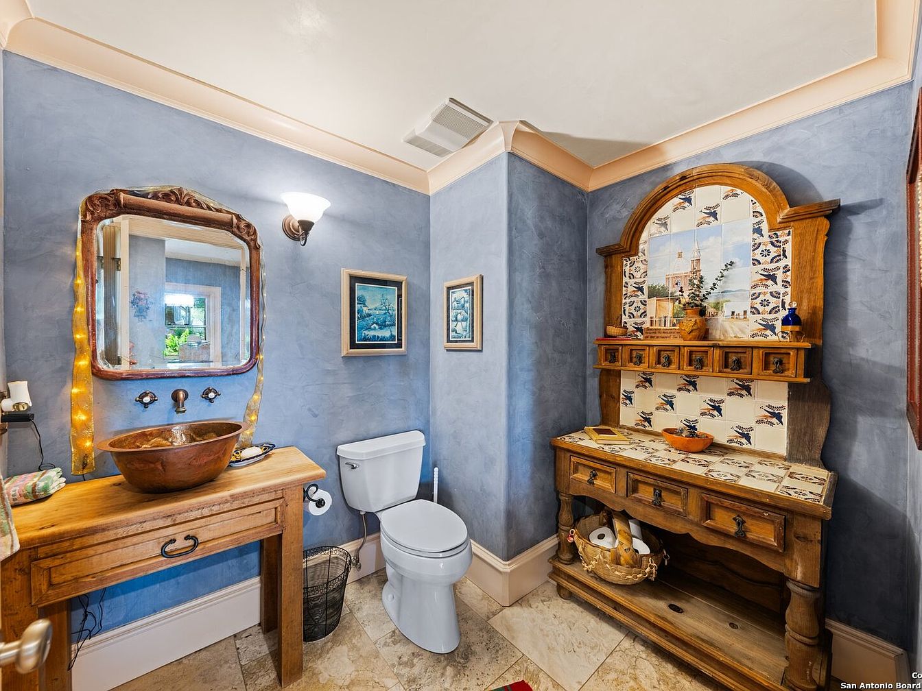 This cozy guest bathroom combines rustic charm with artisanal craftsmanship. The walls are finished in a textured blue plaster paired with cream crown molding, creating a soft, airy ambiance. A wooden vanity table supports a distinctive copper vessel sink beneath a framed mirror adorned with subtle string lights for a warm glow. The white toilet sits adjacent, flanked by two blue-themed framed artworks. The standout piece is a large wooden hutch with patterned ceramic tiles, showcasing decorative details and practical storage, blending functionality with vintage southwestern style on the stone tile flooring.